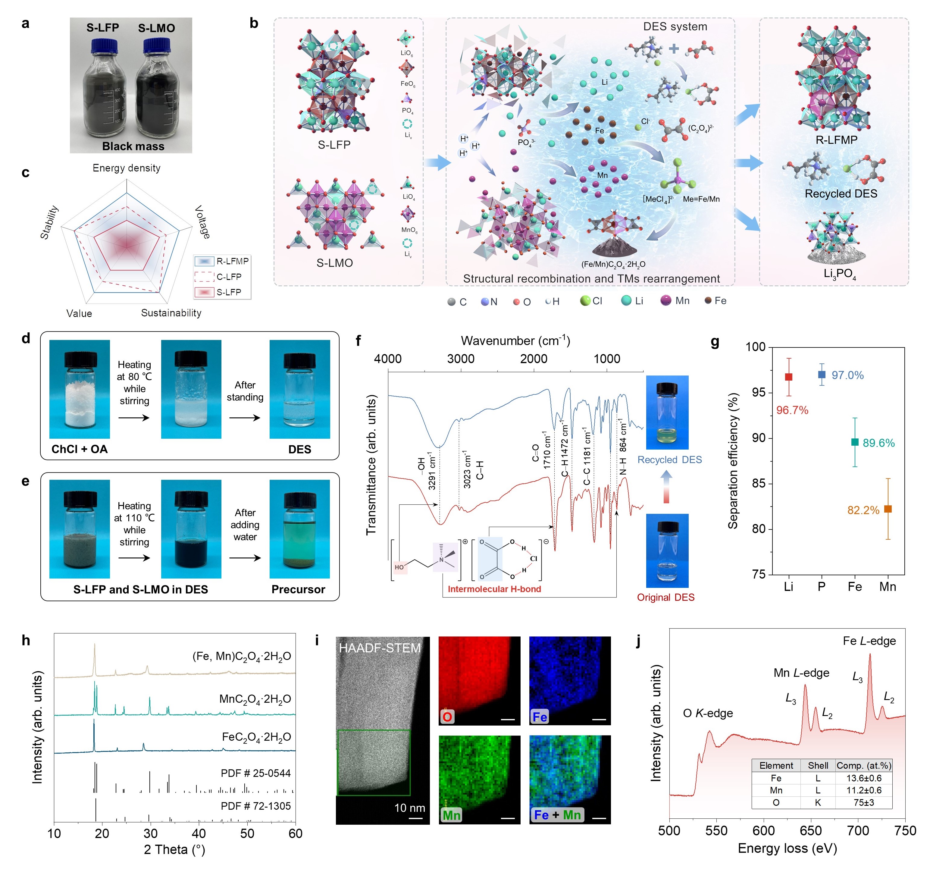 清华新闻网5月23日电 近年来,锂离子电池(LIB)的可持续回收逐渐成为业内关注焦点。在电池的所有组分中,正极材料占据最大重量并主导了电池成本,其回收再利用刻不容缓。商业正极材料包括橄榄石型磷酸铁锂(LFP)、层状钴酸锂/三元材料以及尖晶石锰酸锂(LMO)。因为这些正极具有不同的晶体结构,目前的直接回收方法主要针对单一特定成分,同时处理多种正极材料仍面临很大挑战。传统火法或湿法回收通过高温熔炼或化学过程破坏电池材料,并需要复杂的步骤来分离不同的元素,导致二次污染。更重要的是,失效LFP或LMO电池中的有价元素含量低,而这些方法产生的Fe/Mn产物具有较低经济价值,因此需要发展更好的回收技术来实现混合正极材料的经济回收。