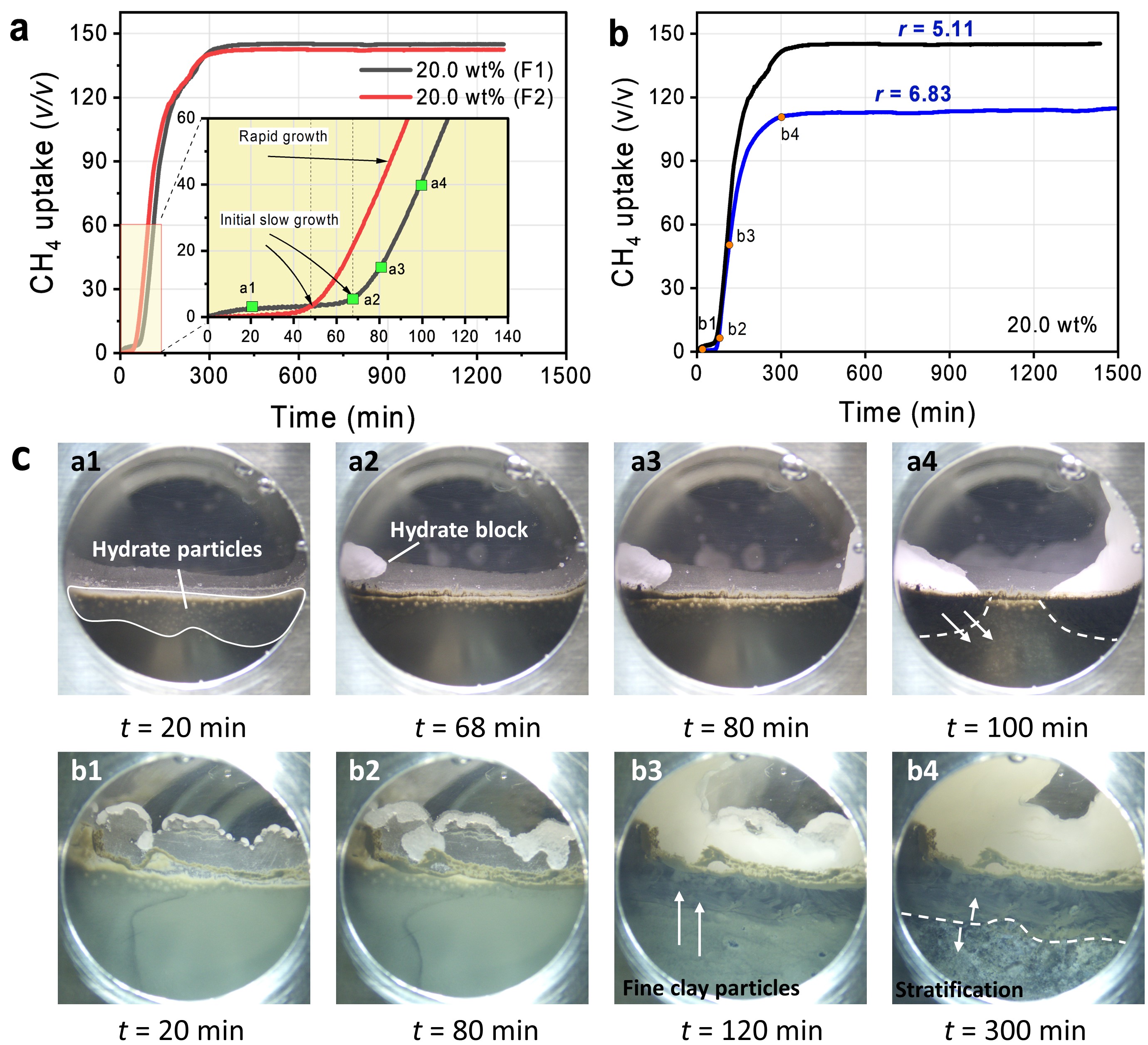 图2.泥质粉砂沉积物悬浮液中甲烷水合物生成过程气体吸收曲线和水合物-沉积物形貌演化过程