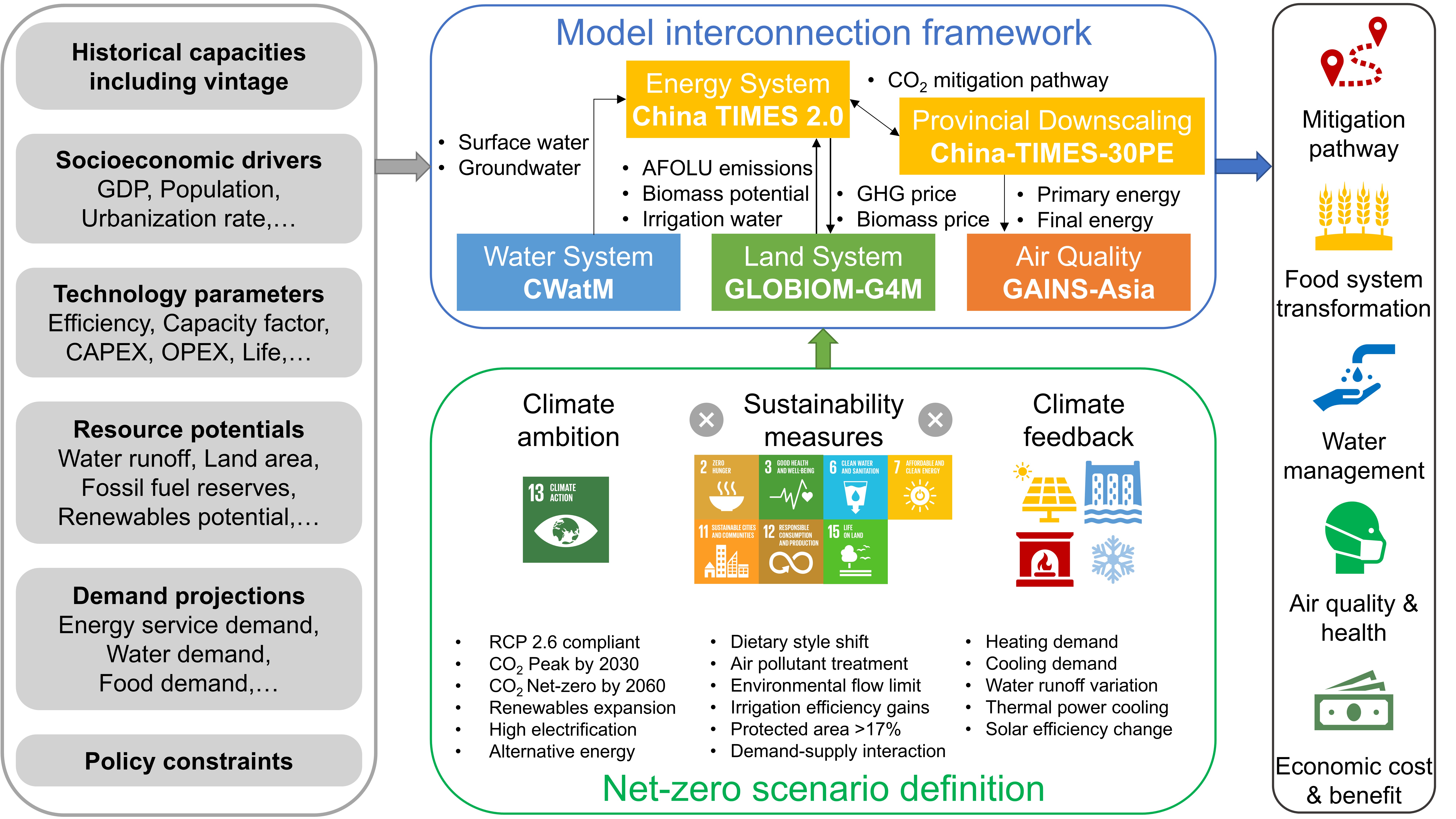 针对这一问题,beat365中文官方网站核能与新能源技术研究院(以下简称“核研院”)陈文颖教授课题组和合作团队建立了一套多模型集成框架,实现了国家级能源模型China TIMES 2.0、省区级能源模型China-TIMES-30PE与土地利用模型GLOBIOM-G4M、水资源管理模型CWatM、空气质量模型GAINS-Asia的连接,综合考虑了气候和能源政策、可持续发展措施和气候反馈,探索和量化了中国在实现碳中和目标过程中,对环境相关可持续发展目标的协同效益和潜在权衡。研究成果为中国实现碳达峰碳中和的同时提高能源、土地、水、空气质量系统的可持续性提供了长期转型路径,为中国形成多系统协同的可持续发展方案提供支撑。