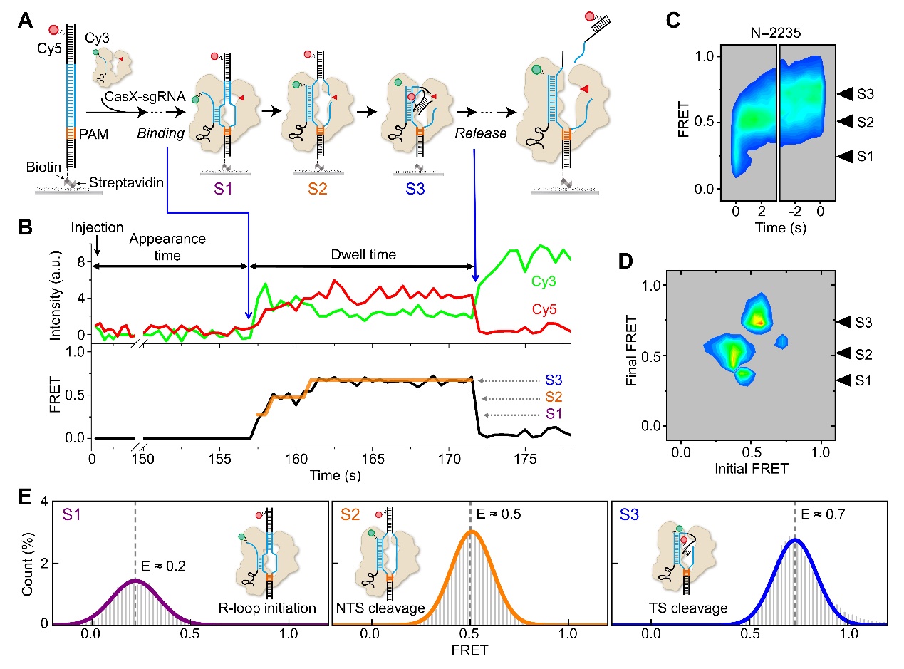 利用供体(Cy3)标记的sgRNA和受体(Cy5)标记的DNA,研究人员通过单分子FRET实验捕捉到CasX蛋白在切割过程中依次呈现的三种构象状态:R-loop起始状态、R-loop形成后非靶标链(NTS)切割状态和靶标链(TS)切割状态(图1)。此外,研究人员还定量分析了sgRNA与DNA的匹配度如何影响CasX在DNA上的稳定性和切割活性,为基于CasX的基因编辑和调控工具的设计提供了重要依据。DpbCasX和PlmCasX在切割特异性上的差异,源于它们在结合DNA及切割过程中的动力学差异;而两者在切割过程中FRET模式的不同,则归因于它们在DNA上切割位点的差异。