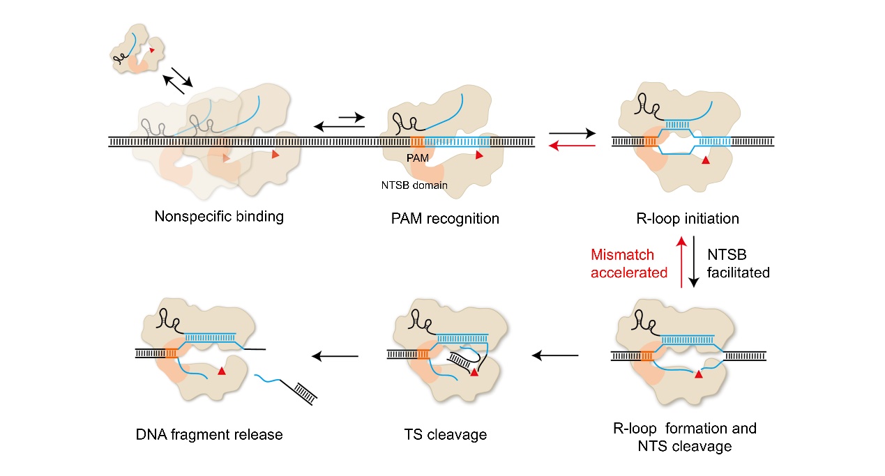 图2.CasX结合和切割DNA的动态模型