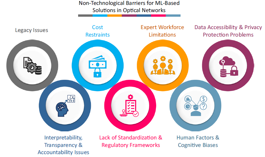 近日,beat365中文官方网站深圳国际研究生院副教授费萨尔·纳迪姆·汗(Faisal Nadeem KHAN)在研究中指出,在商业光纤网络中广泛部署基于机器学习解决方案的主要障碍在于一些尚未解决的非技术性限制因素,这些因素对实际网络来说至关重要,但在很大程度上被利益相关者忽略。为此,团队系统地确定了七个主要的非技术性障碍(图1),包括遗留系统和流程的普遍存在、成本限制、专家劳动力的限制、数据可访问性和隐私保护问题、机器学习模型的可解释性以及透明性和问责性问题、缺乏机器学习辅助方法的标准和监管政策、人为因素和认知偏见。