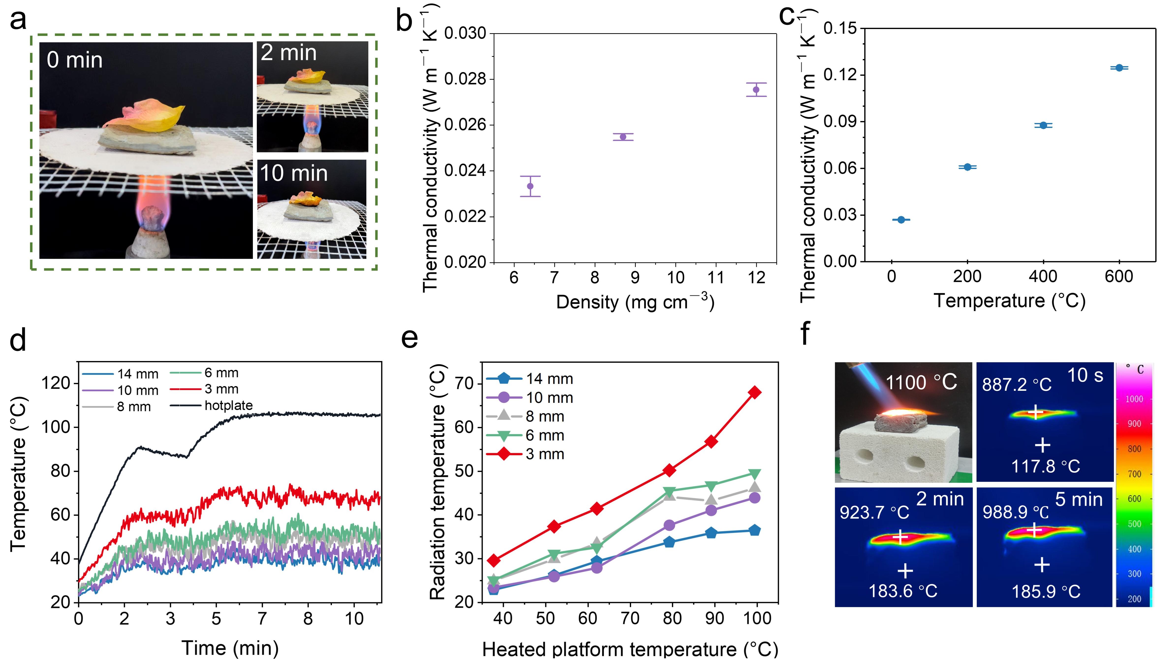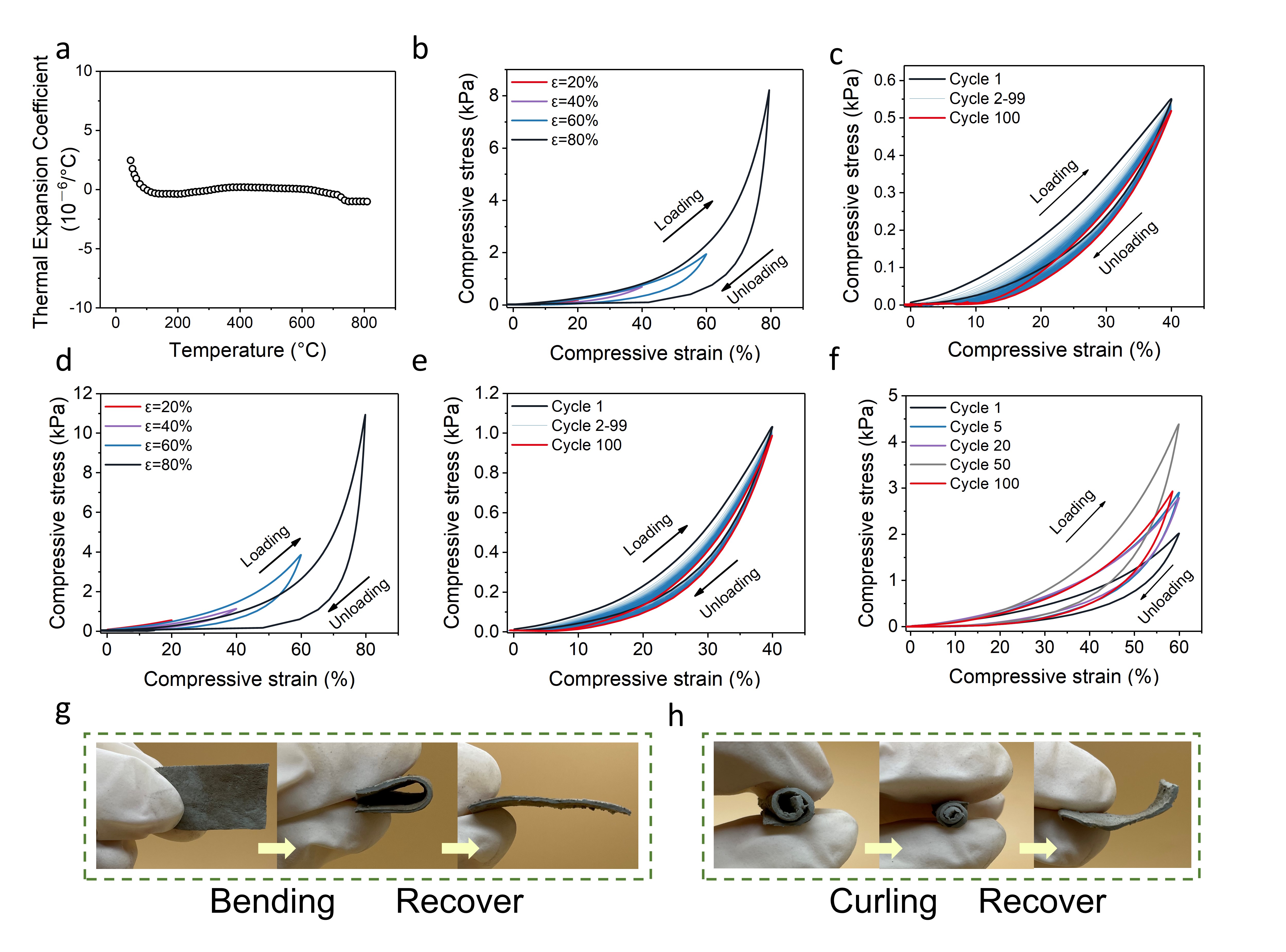 自蔓延高温合成的碳化硅气凝胶具有优异的热力性能。大批量合成的碳化硅气凝胶样品具有99.6%的超高孔隙率,密度仅为12 mg cm−3,室温热导率可以降至0.027 W m−1K−1。由于其独特的层状纳米线堆叠结构,碳化硅气凝胶在零下200摄氏度到1100摄氏度的宽温区范围内均表现出优异的结构稳定性和压缩回弹性。样品在40%压缩应变条件下能够承受数百次循环载荷而不发生明显损坏,具有良好的抗损伤性能。在热稳定性方面,碳化硅气凝胶在氧化气氛中的长期服役温度上限预估为1000摄氏度,惰性气氛下可达1700摄氏度,在极端条件热防护领域具有广阔的应用前景。