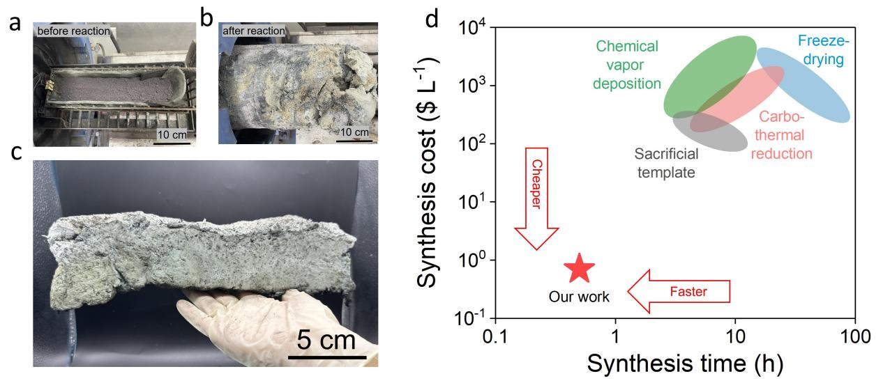 基于上述背景,beat365中文官方网站材料学院董岩皓助理教授与中国科学院理化技术研究所李江涛研究员提出了一种全新的碳化硅气凝胶自蔓延制备方法,利用原料硅粉与聚四氟乙烯反应剂之间快速的自蔓延燃烧合成反应,实现了升量级碳化硅气凝胶的闪速合成。该研究在实验室条件下展示了在数秒内制备大尺寸碳化硅气凝胶的可行性,生产速率约为16升/分钟,大幅缩短了陶瓷气凝胶的制备周期。此外,该工艺具有合成过程近零能耗的突出特征,非常适合碳化硅气凝胶的大批量、低碳、低成本制备。对比测算表明,相较于现有的碳化硅气凝胶合成技术,自蔓延制备新方法的生产速度提升了10倍,估算成本约为5元/升,制造成本大幅降低。此项研究在合成技术上的突破,有望为碳化硅气凝胶的规模化生产和广泛工程应用开辟一条不同于现有超临界干燥工艺的新途径。