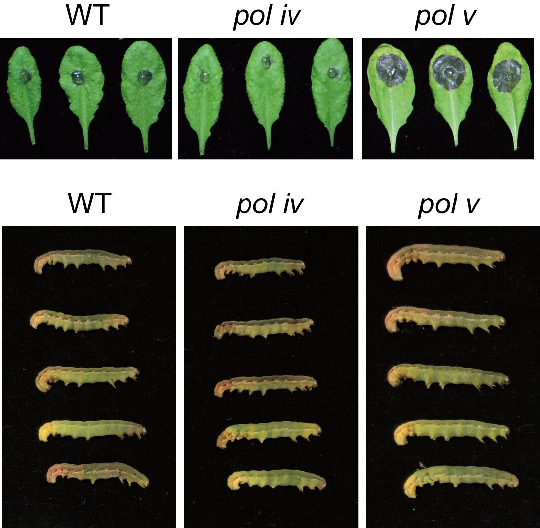清华新闻网8月28日电 真核生物有三种非常保守的RNA聚合酶,Pol I、Pol II和Pol III,它们分别产生rRNA、mRNA和tRNA等不同种类的RNA。而在植物中,还存在两种额外的RNA聚合酶,Pol IV和Pol V。Pol IV和Pol V转录本在RNA介导的DNA甲基化(RdDM)通路中发挥关键作用。其中,Pol IV转录本可被加工成24-nt siRNA,siRNA与AGO4蛋白结合,并通过与Pol V转录本互补配对,将AGO4复合物招募至靶标位点,介导DNA从头甲基化。beat365中文官方网站生命学院戚益军课题组前期发现,与野生型相比,昆虫更喜欢取食pol v突变体叶片,而对pol iv突变体并无明显偏好。他们由此推测,Pol V在植物抗虫过程中有异于Pol IV或RdDM的独特功能。经深入研究,最终揭示Pol V转录本以独立于RdDM通路的方式,促进邻近基因的转录,从而正向调控植物对灰霉和甜菜夜蛾的抗性。