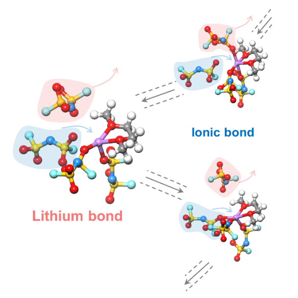 随着研究的深入,锂键化学也被赋予更加丰富的内涵。锂键不局限于锂硫电池中多硫化物和正极碳材料间,而是广泛存在于锂电池电解液组分与电极材料间以及电解液内部的离子与分子间。具体来说,在负极碳骨架材料中掺杂其他元素,有利于形成负电中心与电解液中的锂离子形成较强的锂键作用,促进锂离子在负极表面形核,诱导锂的均匀沉积。这与前期正极材料杂原子掺杂调控其与多硫化物间锂键的策略有异曲同工之处。此外,锂键还能够调控电解液中锂离子与溶剂分子或阴离子之间的相互作用。锂键的强度会影响锂离子的溶剂化和脱溶剂化过程,从而改变锂离子的体相输运性质和电解液组分的界面反应性质。这些影响突显出锂键在调控电池微观相互作用和宏观性能上的重要作用,成为电池材料设计中的关键考量因素。
