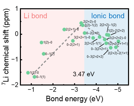 研究团队以电解液中锂离子与溶剂、阴离子形成的不同配位结构作为模型体系,计算中心锂原子对应的NMR化学位移。结果显示,随着总键能增大、平均键长增长、配位数升高,7Li化学位移呈现先向低场移动、后向高场移动的变化趋势。以4配位为临界点,低(小于等于4)和高(大于4)配位数时锂与配位原子成键分别对应锂键和锂离子键,其中形成锂键时的NMR信号随键能的变化规律与氢键体系的规律一致。
