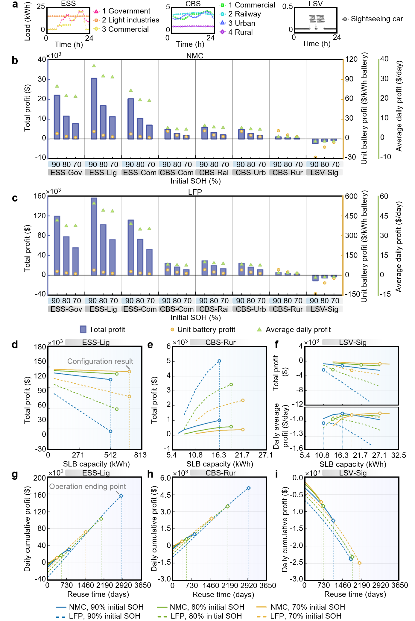 团队重点研究了两种主要正极材料类型的退役电池——镍钴锰(NMC)和磷酸铁锂(LFP),分析了退役电池在多种再利用场景和回收技术中的表现。如图2所示,不同的评估指标会影响最佳再利用场景的选择。基于总利润表现,储能站场景是最佳选择,而在平均日利润上,通信基站场景最具优势。用户可根据总利润、单位电池利润、平均日利润和碳足迹等指标来选择满足其需求的再利用电池参数,包括材料类型、使用的SOH范围、容量衰减趋势和充放电效率等。