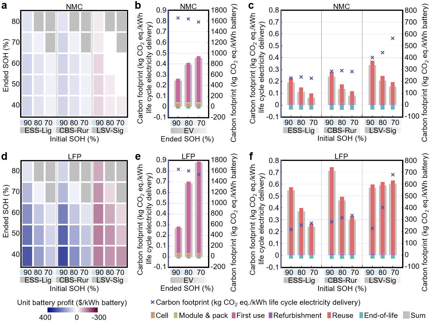 团队进一步对比评估了不同类型退役电池在生命周期中的经济效益和碳足迹(图4)。LFP电池在整体经济效益上优于NMC电池,但其碳足迹在首次使用和再利用阶段高于NMC电池,两者在再利用阶段的碳足迹趋势也不同。这表明,不同参数电池在同样的再利用和回收场景中会得到不同的经济效益和碳足迹,突显了整体路径设计的重要性。