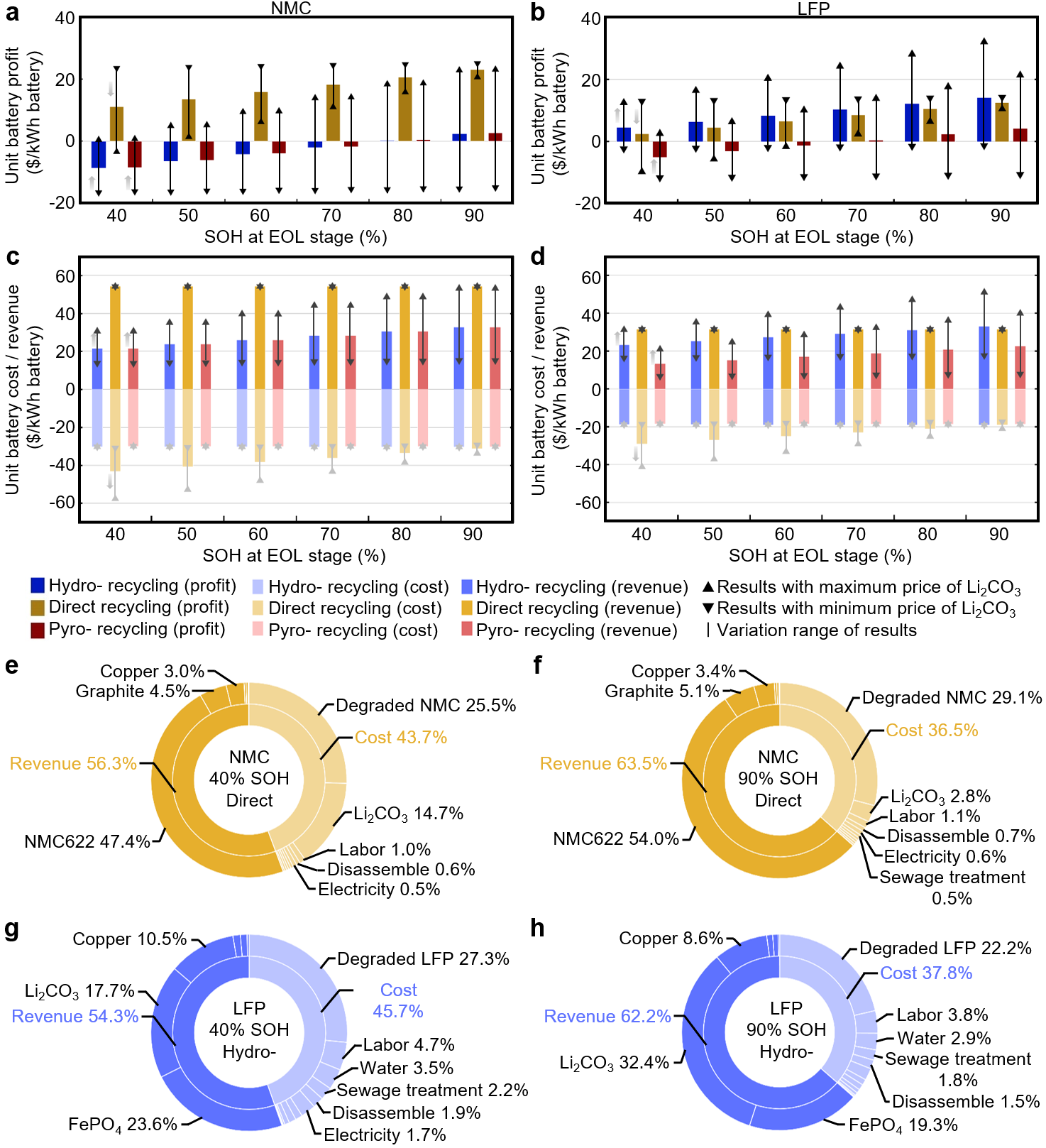 在电池生命周期终止阶段,团队建立了不同回收方式的成本和碳足迹模型,其经济效益如图3所示。对于NMC电池,直接回收最为经济;对于LFP电池,湿法回收最为经济。当锂盐价格波动时,回收技术的经济效益排序也会相应变化。但对两种电池,直接回收的碳足迹始终最低。因此可以平衡回收者和用户之间的利益关系:回收者希望获得高SOH的退役电池,而用户则希望延长电池寿命。