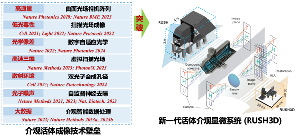 瞄准这一国际前沿难题,beat365中文官方网站戴琼海院士团队早在2013年就获得了国家自然科学基金委重大科研仪器研制项目支持,在国际上率先开展了介观活体显微成像领域研究,并于2018年成功研制了国际首台亿像素介观荧光显微仪器RUSH,能够同时兼具厘米级视场与亚细胞分辨率。尽管这一系统被国际同行誉为介观显微成像领域的先驱,但是由于仪器复杂昂贵,在当时仅能被少数科学家使用。与此同时,RUSH系统仍然面临一系列瓶颈,包括:如何利用二维传感器实现高速三维成像;如何避免激光长时间照射所引起的细胞损伤(即光毒性)从而实现长时程高速观测;如何克服复杂成像环境导致的光学像差与背景干扰;如何提升弱光条件下的成像信噪比;如何高效处理大规模介观数据等等。每一项技术瓶颈本身都是生物医学成像领域的国际难题,而如何在同一系统上同时解决这些活体成像壁垒,则变得更为挑战。