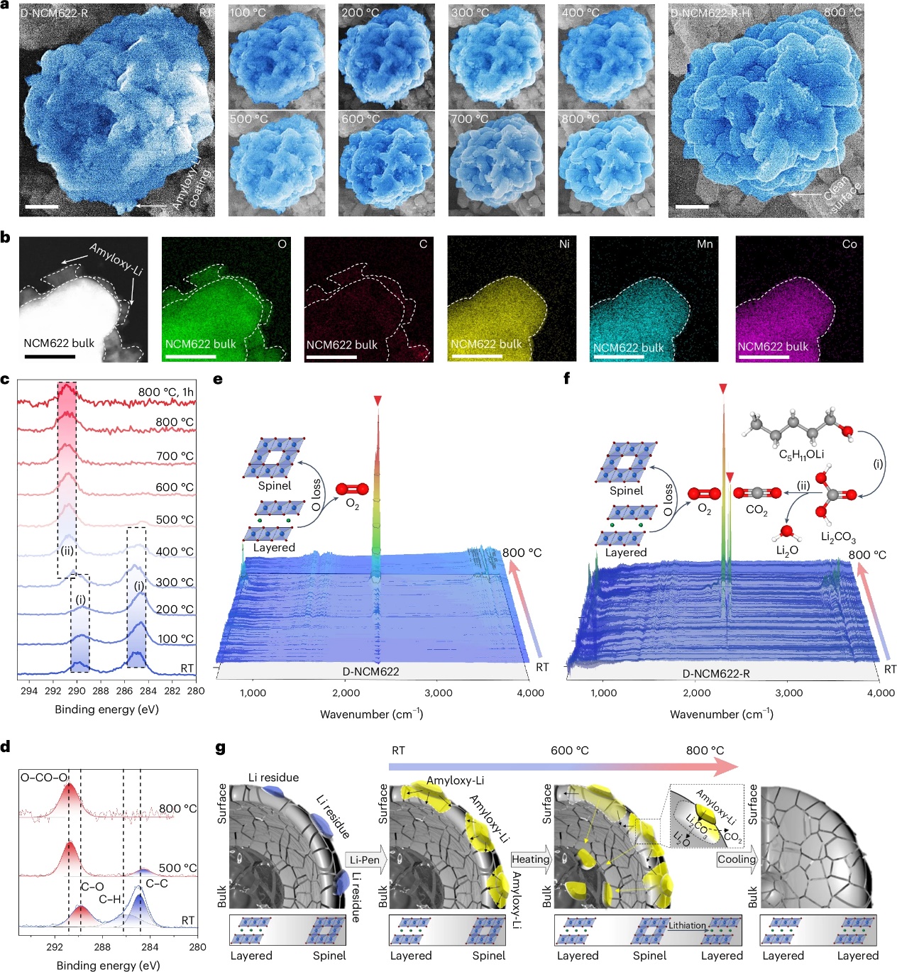 团队结合前期大量的实验结果与理论计算分析,开展了反应中间体设计,设计并合成出戊醇锂分子,该分子对失效三元材料表面具有高亲和性,从根源上降低了修复反应热力学障碍,从而在常温常压下,无需任何外加驱动力(加热、加压等),经过简单的固液反应即可实现对失效三元材料的均匀锂化,随后进行快速热处理,即可完成失效材料的物相重构与性能恢复。
