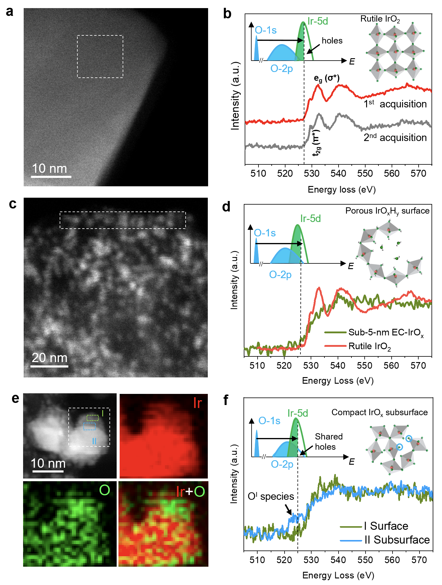 图4.晶态IrO2(a, b)、5 nm以下非晶IrOx纳米颗粒(c, d)、以及5–15 nm的IrOx核壳纳米颗粒(e, f)的STEM-EELS表征