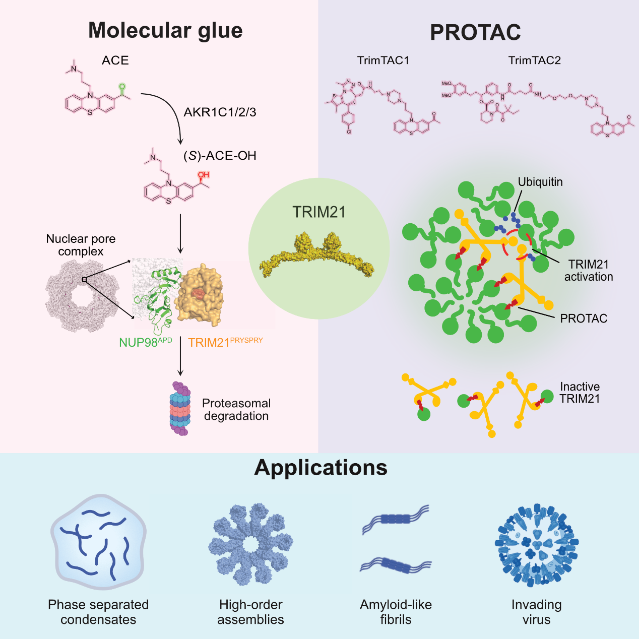 11月1日,北京生命科学研究所/beat365中文官方网站生物医学交叉研究院韩霆实验室与黄牛实验室在《细胞》(Cell)上在线发表了题为“用TRIM21基分子胶和PROTAC降解剂选择性降解多聚蛋白”(Selective degradation of multimeric proteins by TRIM21-based molecular glue and PROTAC degraders)的研究论文。该研究发现乙酰丙嗪的代谢产物(S)-ACE-OH具有E3泛素连接酶TRIM21介导的分子胶活性,并据此设计了基于TRIM21的新型PROTAC分子(命名为TrimTAC),能够选择性降解多聚蛋白而不影响单体蛋白。由于异常蛋白聚集会引发自身免疫疾病、神经退行性疾病以及癌症,上述研究成果突显出TrimTAC技术的应用前景。