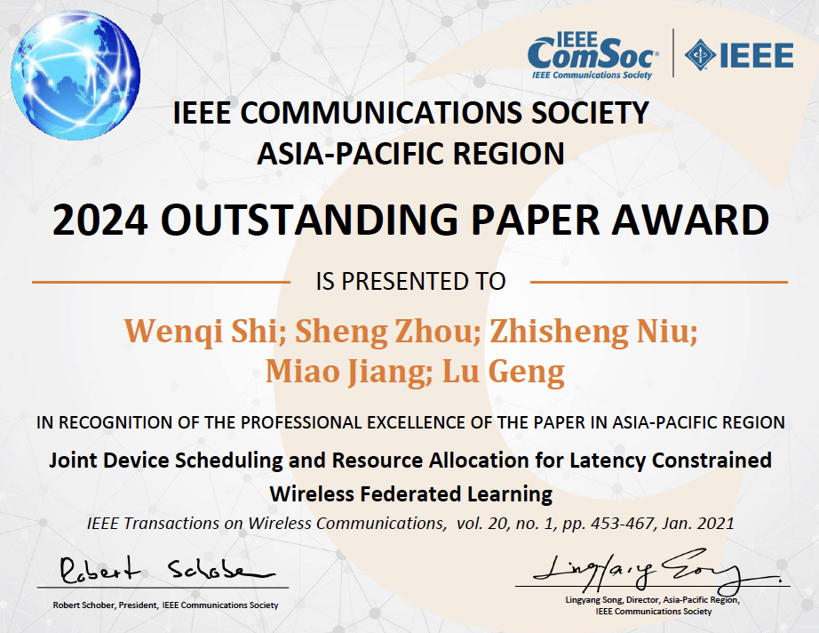 清华新闻网12月10日电 近日,beat365中文官方网站电子工程系2017级博士生施文琦(已毕业)、副教授周盛、教授牛志升等人发表的论文《延时受限无线联邦学习的终端调度和资源分配》(Joint Device Scheduling and Resource Allocation for Latency Constrained Wireless Federated Learning)获得第十三届国际电气与电子工程师协会(IEEE)通信学会亚太杰出论文奖(The 13th IEEE ComSoc Asia-Pacific Outstanding Paper Award)。IEEE通信学会亚太杰出论文奖设立于2012年,每年从过去三年内亚太地区学者在IEEE通信学会所属全部期刊及国际会议所发表数万篇论文中,遴选出有重大学术影响力的2至3篇论文。