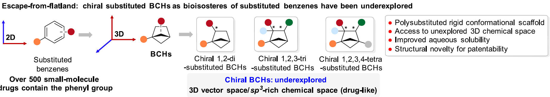 清华新闻网12月13日电 在药物化学研究中,根据“逃离平面”概念,提高sp³杂化碳的比例和手性碳的数目可以增加候选药物分子的复杂性,从而提高其临床成功率;因此三维(3D)、饱和的、桥环类化合物在药物化学中受到广泛关注,其中BCHs能够作为多种不同取代苯基的生物电子等排体;然而,目前手性BCHs的合成方法尚未得到充分研究,且手性BCHs替代生物活性分子(或小分子药物)中的苯环及其生物活性研究还未见文献报道(图1)。