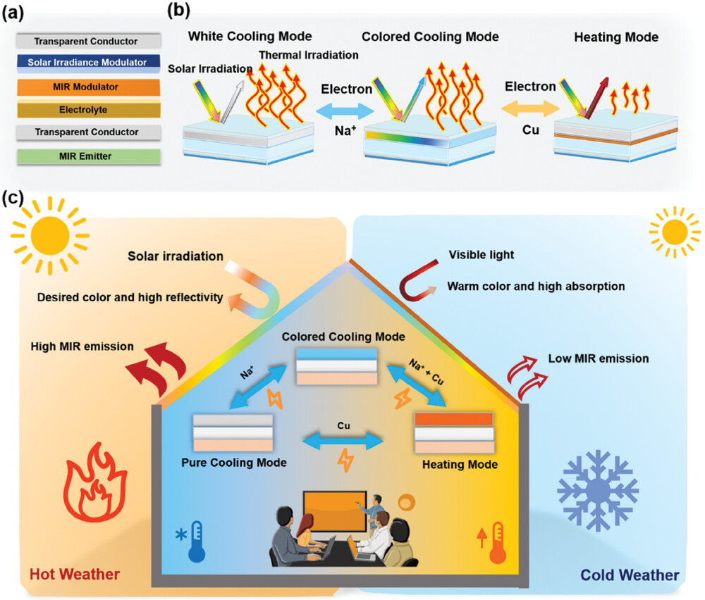 首先,研究团队开发了一种新型的建筑节能技术。众所周知,建筑能耗占全国总能耗的30%左右。如何在满足室内舒适度要求的同时,降低建筑运行能耗和碳排放,已成为亟待解决的核心难题。针对建筑物的非透明式围护结构,研究团队设计并制备了一种电驱动的动态辐射热调控材料,该材料具有多种颜色,适用于全年建筑节能。所制备的动态辐射热调控材料能够动态且独立地调节太阳辐射和中红外辐射,并展示了三种不同的工作模式:加热模式、白色冷却模式和多色彩冷却模式(蓝色、绿色)。所制备的动态辐射热调控材料的热调节能力显著提高,冷却和加热模式之间的功率差异为659 W/m²,温度调节范围高达11℃。模拟计算表明,所制备的动态辐射热调控材料可以在季节性温度变化的城市中减少全年建筑能耗16.75 MJ/m²。这种设计不仅最大化了热调节能力,还满足了审美需求,显示出广泛的实际应用潜力。该工作以“一种适用于建筑全年节能的电驱动动态多色辐射热调节材料”(An Electro-Driven Dynamic and Multicolored Radiative Thermal Regulation Material for All-Year-Round Building Energy Saving)(论文1)为题,于2024年12月1日发表于《先进功能材料》(Advanced Functional Materials)。