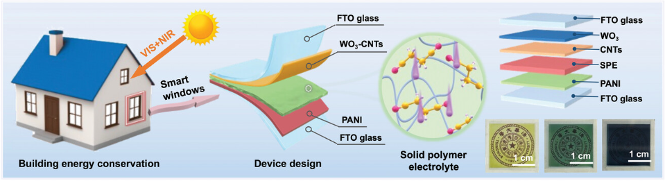 图2.高性能双波段电致变色智能窗的结构示意图及实物照片