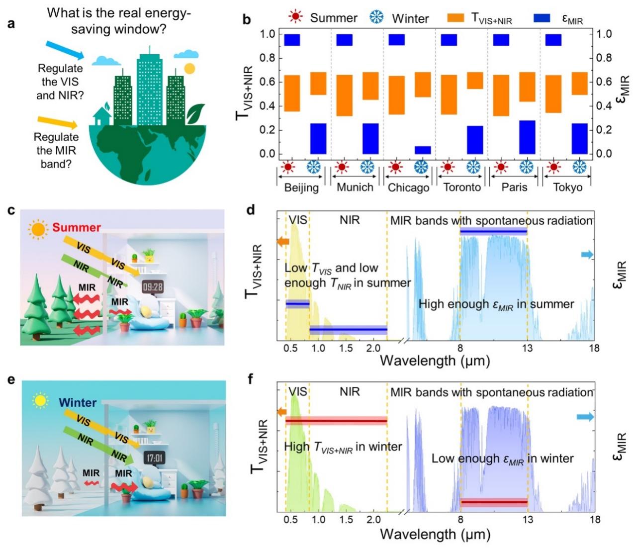 近年来,全球极端天气事件愈加频繁和严重,对人类社会和自然环境带来了重大挑战。据统计,全球每年约16%的能源消耗用于建筑的供暖、通风和空调系统,以保持舒适的室内温度。窗户作为建筑主要的能量交换介质,是建筑物最不节能的部位,所以高性能节能智能窗的开发对减少建筑能耗起着关键作用。窗户的热传递主要包括导热、对流和热辐射三种方式,其中热辐射占总热传递的50%以上,是实现窗户高效光热管理的关键。热辐射涉及可见光(380-780nm)、近红外光(780-2500nm)和中红外光(8-13μm)波段。因此,为减少建筑能耗、提高照明效率并适应不同季节条件,新型的建筑节能智能窗需要对可见光到中红外光波段的光谱调控能力进行全面优化。电致变色材料能够通过改变电压来改变自身颜色和光线的透过率,是一种非常有前景的降低能耗和改善室内热舒适度的建筑节能窗技术。然而,目前大多数电致变色材料的研究主要集中于可见光和近红外波段的动态调控,它们对中红外波段的动态调控能力较为薄弱,成为限制建筑节能智能窗性能提升的主要瓶颈。