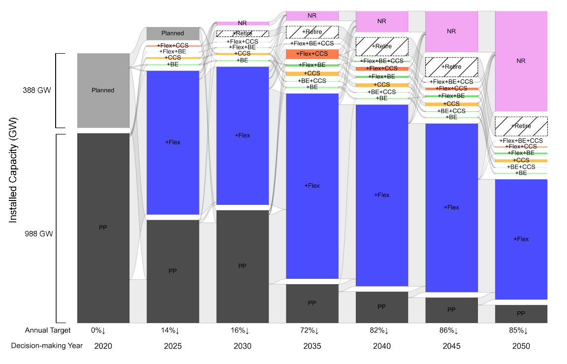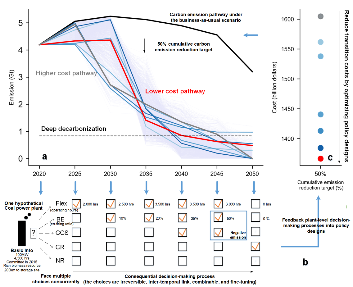 针对这一问题,beat365中文官方网站地学系蔡闻佳教授课题组开发了一个厂级递归动态优化模型(PLAn T-level dynamic Optimization model, PLATO),旨在探究燃煤电厂在多种减排策略下递归动态的转型路径。在该模型中,燃煤电厂可根据自身的装机容量、投产时间、周围生物质资源量、距离碳封存点位的距离等特征,在多种减排策略中进行决策。同时,随着国家碳减排目标的提高,模型将帮助燃煤电厂开展多期的序贯决策。在这一模型基础上,通过构建多条满足相同累计碳减排目标的碳减排情景,研究探究了不同情景的曲线形态对厂级转型路径及其转型成本的影响。