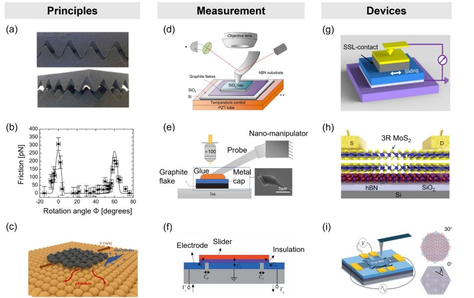 根据功能特性,滑动器件可分为机械滑动器件(Mechanical Slidevices)、电子滑动器件(Electronic Slidevices)和可重构滑动器件(Reconfigurable Slidevices)三大类。机械滑动器件作为滑动器件的典型代表,包括微型线性轴承和旋转马达等,其核心特征在于可实现大位移平动和大角度旋转,同时保持极低摩擦系数和优异耐久性能;电子滑动器件通过滑动界面的电子效应实现能量转换和信息存储,代表性器件包括微纳米发电机、滑移铁电器件。超滑技术的引入可显著降低摩擦或钉扎势垒,对于提升铁电翻转稳定性、降低驱动能耗具有革命性意义;可重构滑动器件通过滑动或旋转实现物理结构的动态重构,从而完成功能切换或多功能集成,其典型案例有通过扭转操作调控其电子能带结构的二维材料异质结、借助滑动操作实现器件功能实时重构的动态功能器件等。