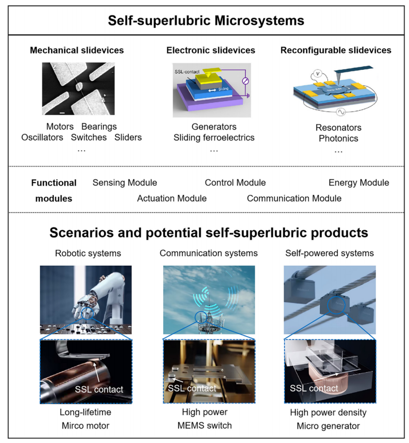 清华新闻网4月18日电 微系统集成了传感、通信、处理、执行和微能源等多种功能单元,被视作21世纪的革命性技术之一。随着科学技术的进步以及人形机器人、无人机、6G通讯技术等新兴产业的兴起,微系统面临着实现更低功耗与更长寿命(甚至全寿命)的迫切需求。在这一背景下,基于半导体和传统微机电系统(MEMS)的传统微系统遭遇技术瓶颈,而具有极低摩擦和零磨损特性的自超滑技术,为微系统的发展带来了全新机遇。