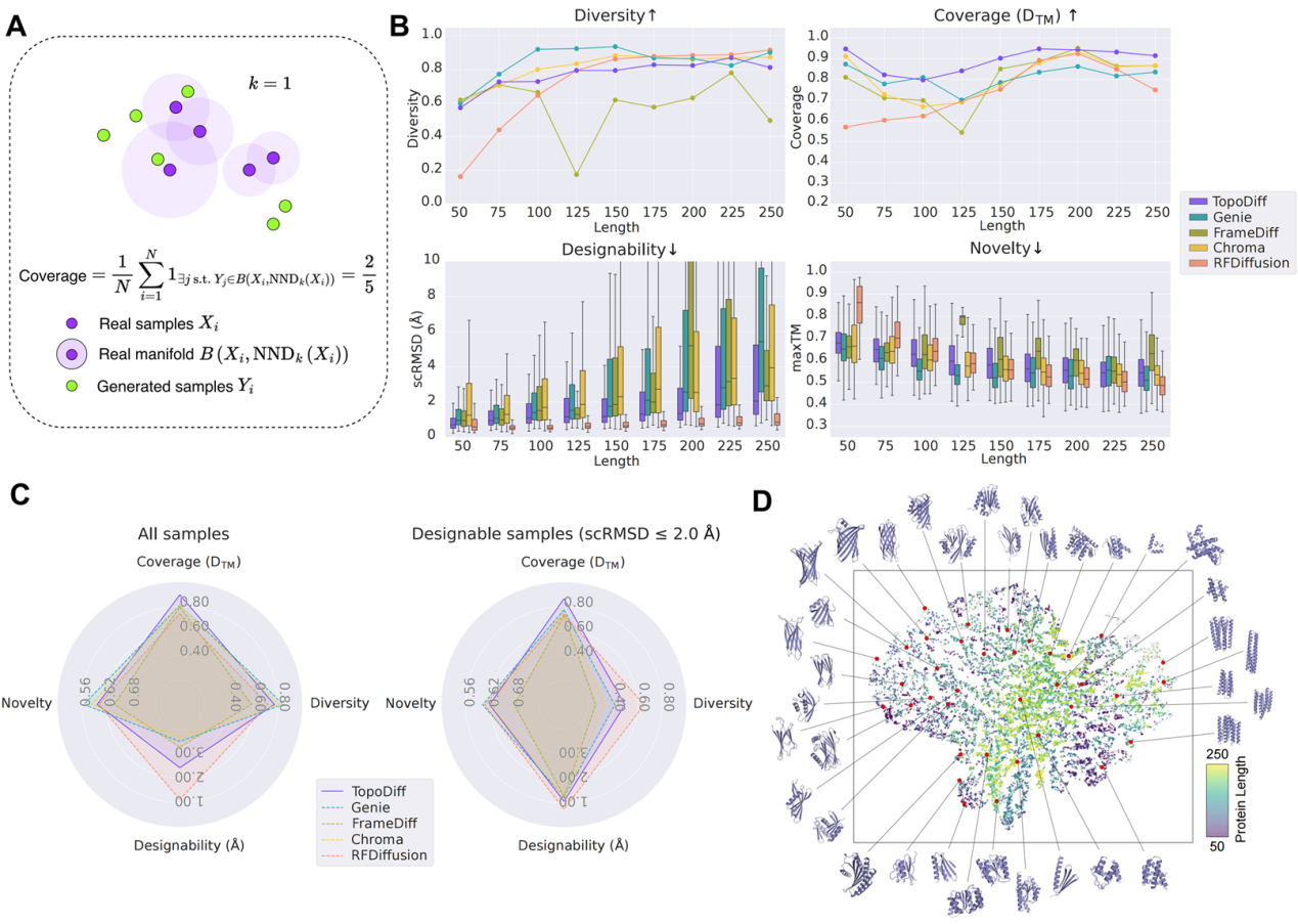 为定量评估模型对已知折叠空间的覆盖能力,解决现有指标的空白,团队首次在蛋白质设计领域引入了“覆盖度”(Coverage)评估指标。与多个前沿模型的性能基准测试结果显示,TopoDiff在保持高可设计性的同时,其覆盖度指标显著优于所有基线模型,尤其是在传统模型代表性不足的折叠类型上,展现出明显的优势,有效修正了采样偏差。更有趣的是,其独特的隐空间设计解锁了多种全新的可控生成模式,如属性引导生成、隐编码插值、全局与局部协同控制等,极大地丰富了蛋白质设计的工具箱。