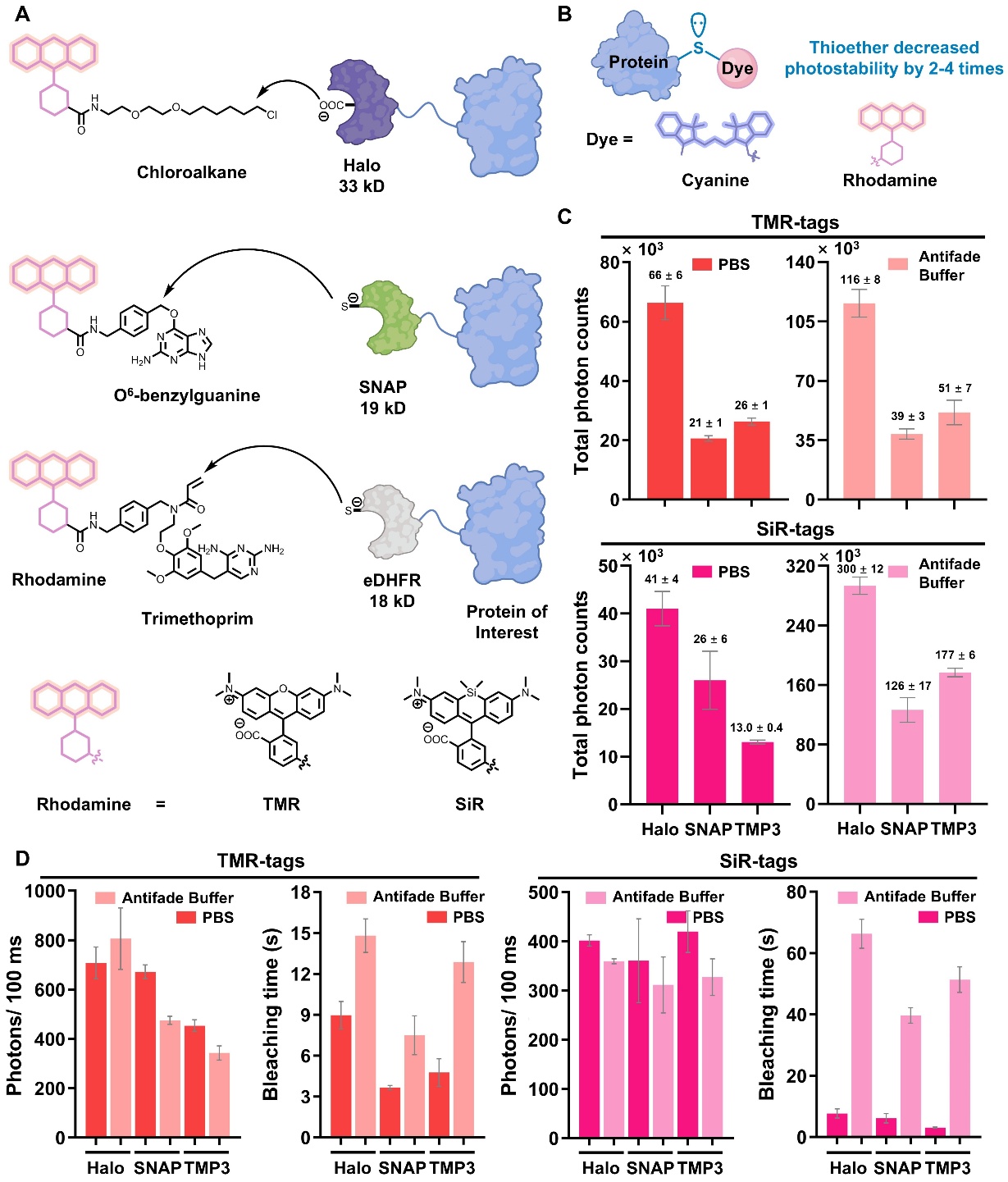 研究团队前期的工作发现,邻近硫醚基团的存在会显著降低染料的光稳定性。对于目前广泛应用的三类SLPs而言,SNAP-tag和TMP-tag3在共价结合过程中均会在染料附近生成硫醚基团,而HaloTag的共价反应不产生硫醚。已有研究指出,对于同一罗丹明染料在HaloTag体系中的光稳定性往往优于在SNAP-tag中的表现。研究团队推测,这种差异可能部分源于SNAP-tag和TMP-tag3所固有的硫醚基团带来的负面影响。