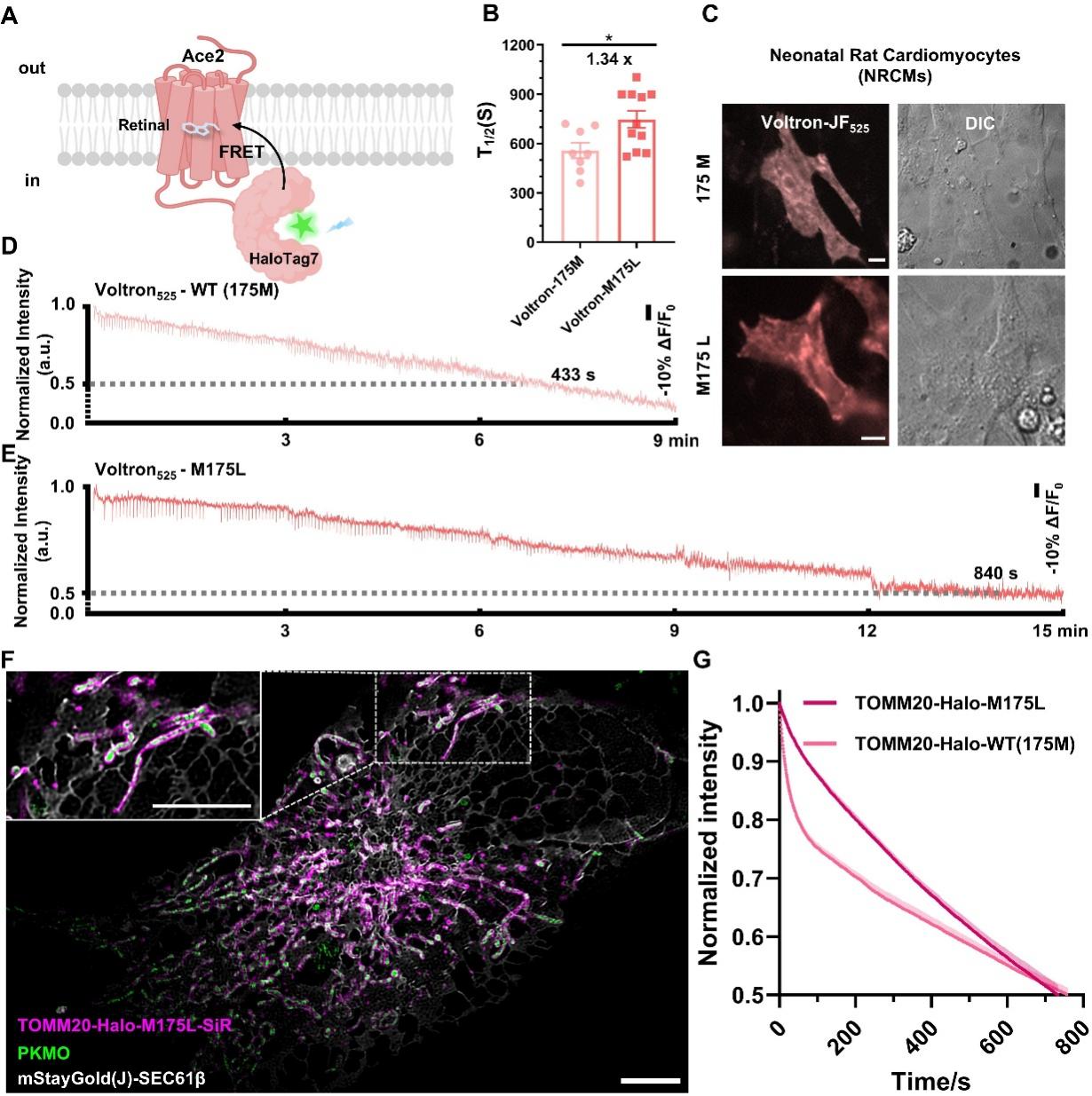 图2 HaloTag-M175L在电压和SIM成像中改善罗丹明染料的光稳定性