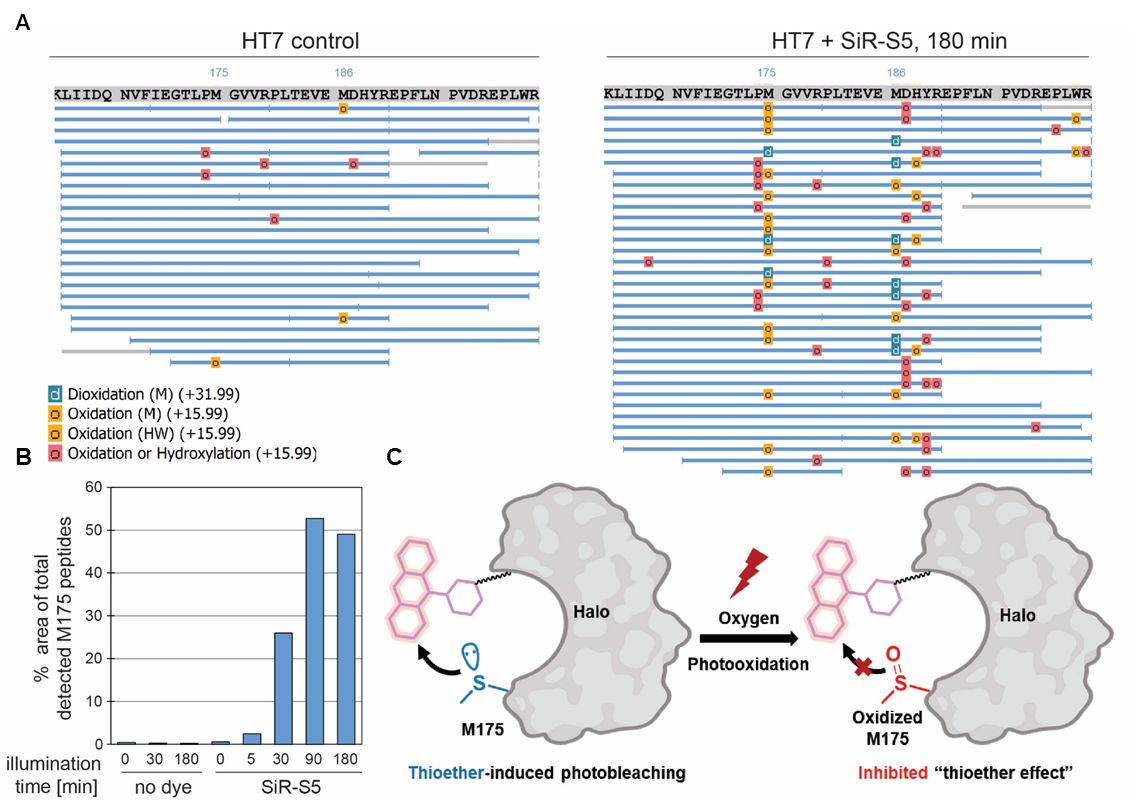 研究团队在多种细胞成像条件下观察到,M175与M175L之间的光漂白速率差异在初始阶段显著高于后续阶段,这可能源自不同阶段下不同的光化学机理。在前面的工具开发中,M175已经被证明为是HaloTag中可以提升光稳定性的关键位点。为进一步研究其背后的化学机制,研究团队与Kai Johnsson课题组的Julian Kompa展开合作,利用可交换HaloTag工具,对染料-蛋白复合体的光照过程进行蛋白质质谱监测。发展在染料被激发的条件下,HaloTag中的Met175发生了特征性的氧化。据此,研究团队推测,对于广泛应用于活细胞成像的HaloTag,其M175的存在导致了成像前期光漂白的加速;而后期,由于M175中的硫醚基团被氧化为亚砜或砜,使得硫醚效应不复存在,从而使得光漂白的后期不受到硫醚效应的干扰,进而减缓了光漂白速率(图3)。