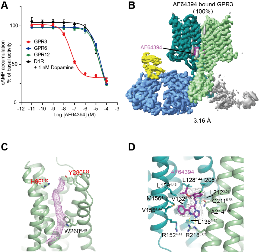 GPR3与 GPR6 和 GPR12 同属一个亚家族,与内源性大麻素受体具有结构相似性,广泛参与神经元分化、情绪调节、疼痛感知及脂肪代谢等多种生理过程,且与阿尔茨海默症和帕金森病等重大疾病密切相关。针对该家族受体的研究为开发针对神经退行性疾病如阿尔茨海默症和帕金森病的新疗法提供了理论基础。