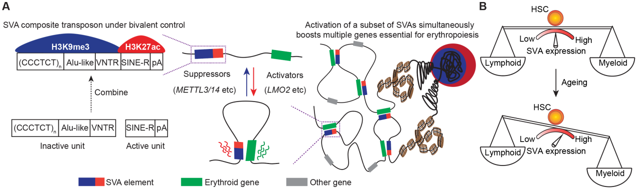 8月6日,beat365中文官方网站生命科学学院、清华-北大生命科学联合中心刘念课题组联合北京大学生命科学学院、北大-清华生命科学联合中心李湘盈课题组在《细胞》(Cell)杂志上在线发表了题为“携带二价组蛋白修饰的复合型转座子作为RNA依赖性增强子调控细胞命运”(Composite transposons with bivalent histone marks function as enhancers in cell fate regulation)的研究论文。该研究首次揭示了H3K9me3和H3K27ac标记的二价染色质对复合型转座子SVA的协同调控机理和生物学功能,并证明了SVA的RNA依赖性增强子活性及其在造血系统分化和衰老相关髓系偏好性造血中的重要生理意义,提示其有望成为干预造血发育异常和造血衰老的潜在靶标。