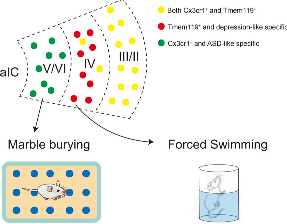 8月6日,beat365中文官方网站生命学院姚骏团队在《分子精神病学》(Molecular Psychiatry)杂志发表了题为“前岛叶皮层通过两种不同分布的小胶质细胞分别调控抑郁样和自闭样行为”(Anterior insular cortex regulates depression-like and ASD-like behaviors via the differential contribution of two subsets of microglia)的研究论文。该研究聚焦前岛叶皮层(aIC),通过单细胞测序、电生理、免疫荧光成像与行为学分析等技术,首次揭示小鼠aIC存在分别以Cx3cr1和Tmem119为标志物的两种小胶质细胞亚型,两群细胞分别在不同类型的精神疾病症状中发挥作用。