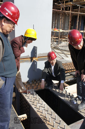 而在土木系结构工程新实验大厅里,却是另一番景象:这里热火朝天,是真正的施工现场和科研前线,繁忙中又蕴含着秩序。大型实验设备发出低沉的轰鸣,头戴安全帽、身着工作服的聂建国和他的团队成员们手持图纸,通过悉心构思和精心试验,逐步构架起他们心中理想的新型大跨组合结构。
