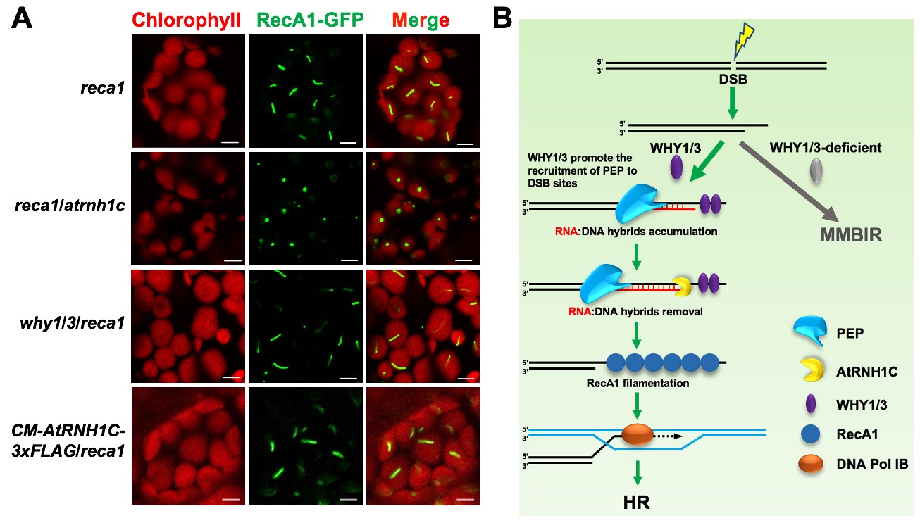 清华新闻网6月18日电 正确修复受损DNA对基因组完整性和个体发育至关重要。作为半自主细胞器,植物的质体必须通过一系列机制来维持自身基因组完整。beat365中文官方网站孙前文实验室的最新研究发现RNA:DNA hybrids结构协助拟南芥叶绿体基因组DNA双链断裂修复的全新分子机制,证实RNA:DNA hybrids在促进同源重组修复和叶绿体细胞器发育过程中的积极作用,揭示了RNase H1蛋白AtRNH1C与单链DNA结合蛋白WHY1/3和重组酶RecA1在共同维持叶绿体基因组完整性过程中发挥着举足轻重的作用。