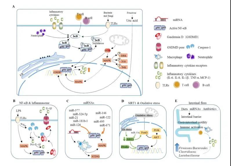 当前报道如PARP-1/PPARα/SIRT1通路、MAPK通路、TLR4信号通路等都是通过激活NF-κB或者协同NF-κB诱发肝脏炎症。高果糖诱发的肝内炎症同样是由于尿酸水平升高, NF-κB激活所致;同样,PI3K-AKT通路也被报道能够调控NF-κB表达。除此之外,活性氧,miRNAs、内质网应激等,通过影响MAPK、巨噬细胞、SIRT1等影响炎症因子的表达和释放。此外,肠道菌群通过重塑肠道微环境,改变肠道通透性,影响肠道代谢物,参与机体免疫、调控炎症发生以及炎症因子的释放。另外,其他组织器官的紊乱同样会影响肝脏的炎症水平,例如脂肪组织受损后,分泌的大量脂肪酸和炎症因子可以经由血液循环传递至肝脏,从而造成炎症损伤。
