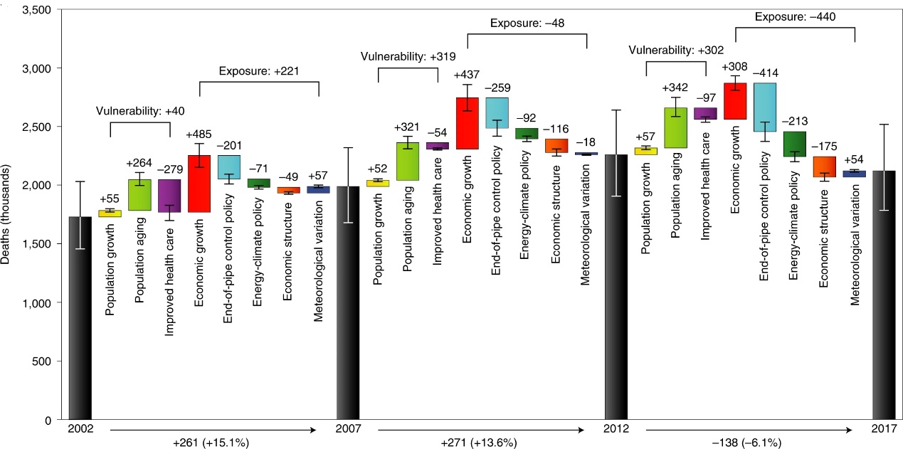 图2 2002-2017年间中国PM2.5相关死亡风险的长期变化趋势及主要驱动因素