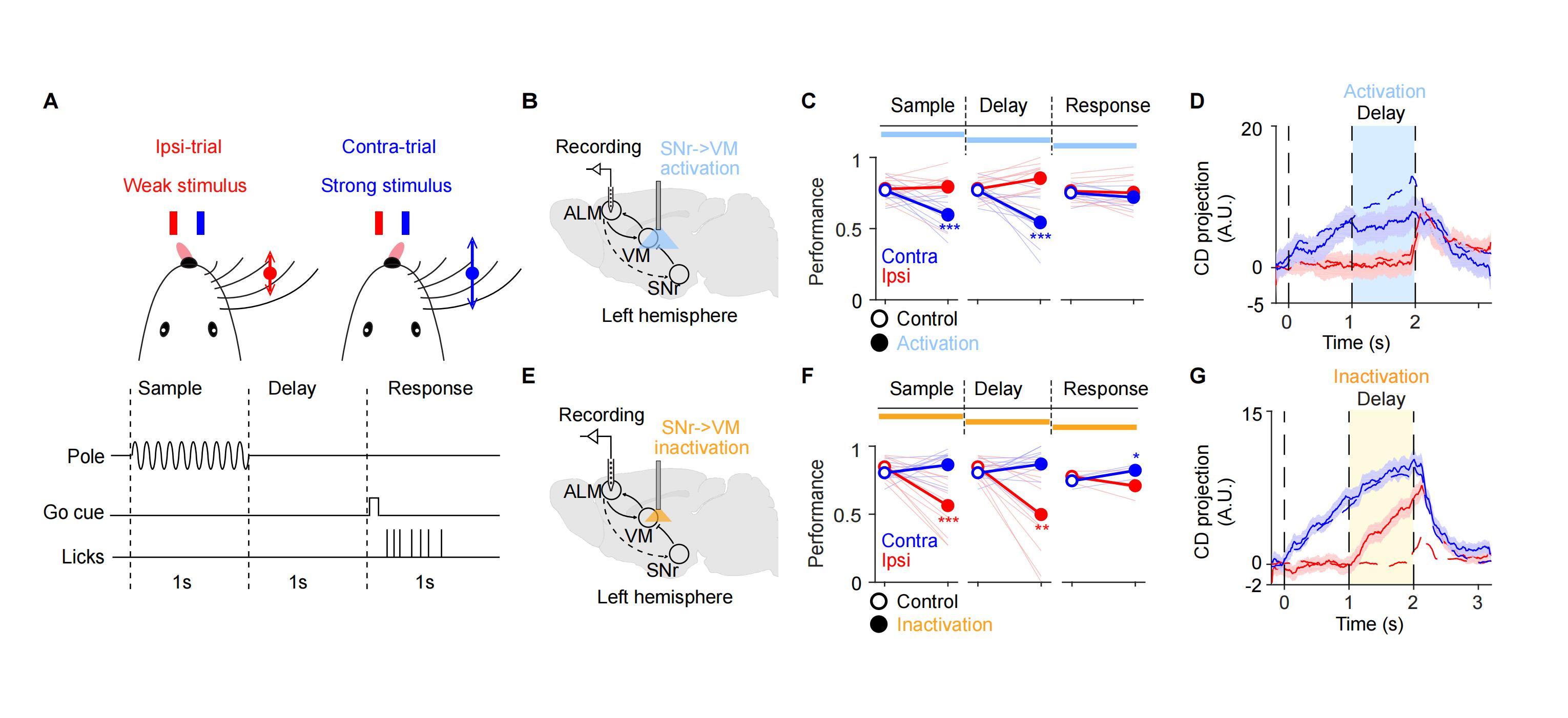 首先,研究者确立基底节系统对工作记忆(短时记忆成分)的重要性。在一个依赖胡须刺激的延迟反应任务中(图1A),研究者采用光遗传技术,在短时记忆区间特异地激活或抑制基底节到丘脑的投射(图1B, E),发现光遗传操控特异地影响小鼠的选择偏好性(图1C, F),这种干扰对ALM神经元在高维空间的活动轨迹也有影响,激活黑质网状部(SNr)到丘脑的投射特异性地推动ALM神经元对侧实验轨迹向同侧靠近,而抑制则相反(图1D, G)。操控丘脑的另一个抑制性输入并不能特异性调控ALM轨迹,表明基底节到丘脑的投射有选择性地调控皮层对工作记忆的编码。