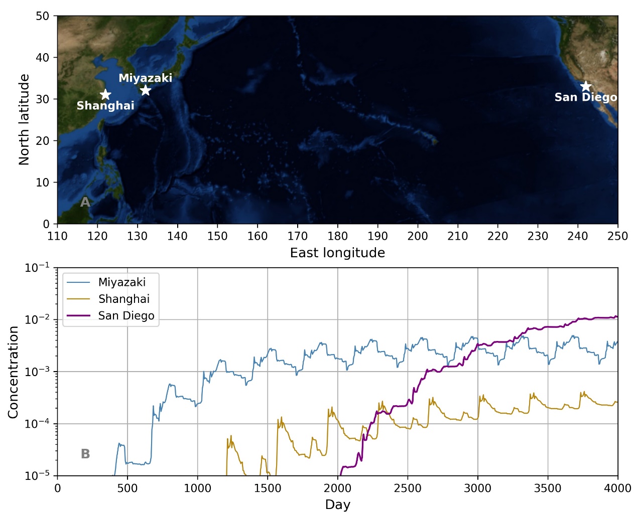 研究人员进一步选取了日本宫崎、中国上海和美国圣迭戈这三个沿海城市进行对比,从污染物浓度变化曲线图中可以发现,在第4000天时圣迭戈附近的污染物浓度大约为0.01个单位,这一数值已经是宫崎的三倍左右、上海的40倍左右。出现这一现象的原因主要是日本附近强烈的洋流作用,福岛处于日本暖流(向北)和千岛寒流(向南)交汇的地方,所以大部分污染物不会沿着陆地边缘向南北方向迁移,而是随着北太平洋暖流向东扩散。这一结果也意味着,在核废水排放的早期,应主要考虑它对亚洲沿岸的影响。但在后期,由于北美沿岸海域的污染物浓度将持续高于大部分东亚沿岸海域,需要重点关注北美沿岸海域的受影响情况。