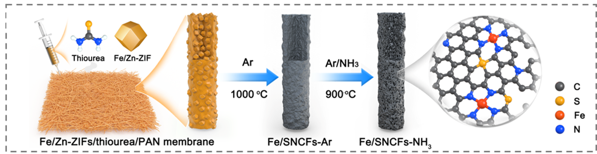 铁单原子修饰多孔共掺杂碳纤维膜制备过程示意图