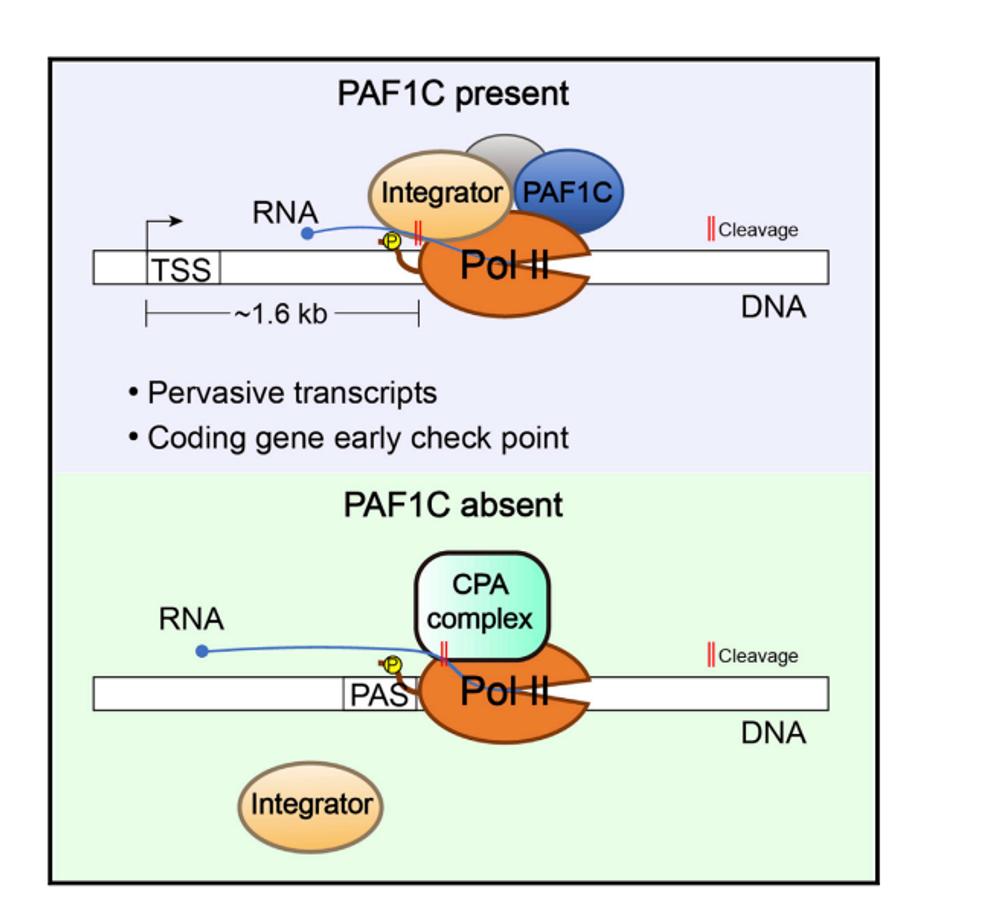 陈默课题组发现PAF1C的缺失可以导致细胞内eRNA和PROMPT的积累,但是它们转录水平并没有明显的提高。随后研究人员发现eRNA和PROMPT在PAF1缺失条件下有明显的延长现象,说明PAF1C在其转录终止和3’末端加工过程中具有重要作用。为探究具体机制,研究人员通过免疫沉淀-质谱联用(IP-MS)发现PAF1C与Integrator complex间存在相互作用,而Integrator缺失复制PAF1C缺失表型。进一步的研究表明PAF1C可以将Integrator招募至染色质以完成对PTs的切割进而诱导转录的终止,且PAF1C的缺失导致转录终止将依靠切割和多腺苷酸化复合体(cleavage and polyadenylation complex,CPA complex)来完成(图1)。有意思的是,不仅仅在非编码区,在编码区,PAF1C也招募Integrator,且在启动子近端停顿(promoter-proximal pausing)的下游1kb左右促进转录终止,这对早期聚合酶延伸复合体起到了质检的作用。值得注意的是,虽然近期徐彦辉教授组和Cramer组分别解析了Integrator和paused elongation complex(PEC)的结构且证实在pause sites Integrator的招募机制,但是pervasive transcripts比pause site产生的转录本长,其中位长度大约1.6k碱基,所以PEC对于Integrator的招募并不足以解释Integrator在pervasive transcripts的招募。