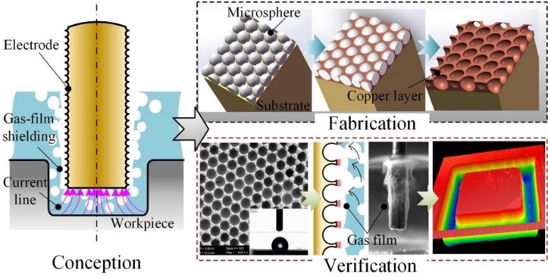 beat365中文官方网站机械工程系精密微纳制造工艺与装备研究团队在前期采用侧壁绝缘膜微细电解加工研究基础上,面向解决侧壁绝缘膜不可靠、易损耗的问题,提出了一种微细工具电极侧壁疏水表面形成的“无形”绝缘气膜提高微细电解加工定域性的方法。该方法探索出单层模板自组装工艺和微细电铸工艺,制备出微纳米尺度球形阵列内凹坑构建的新型侧壁疏水表面微细工具电极。微结构微细电解加工实验表明,这种方法能有效抑制微细电解加工中侧壁杂散腐蚀,提高了微细电解加工的定域性精度。此研究为解决一直困扰微细电解加工杂散腐蚀问题提供了新的解决思路和方案,在微细棒状金属表面构建疏水表面、微结构微细电解加工等领域具有重要的学术价值和应用前景。