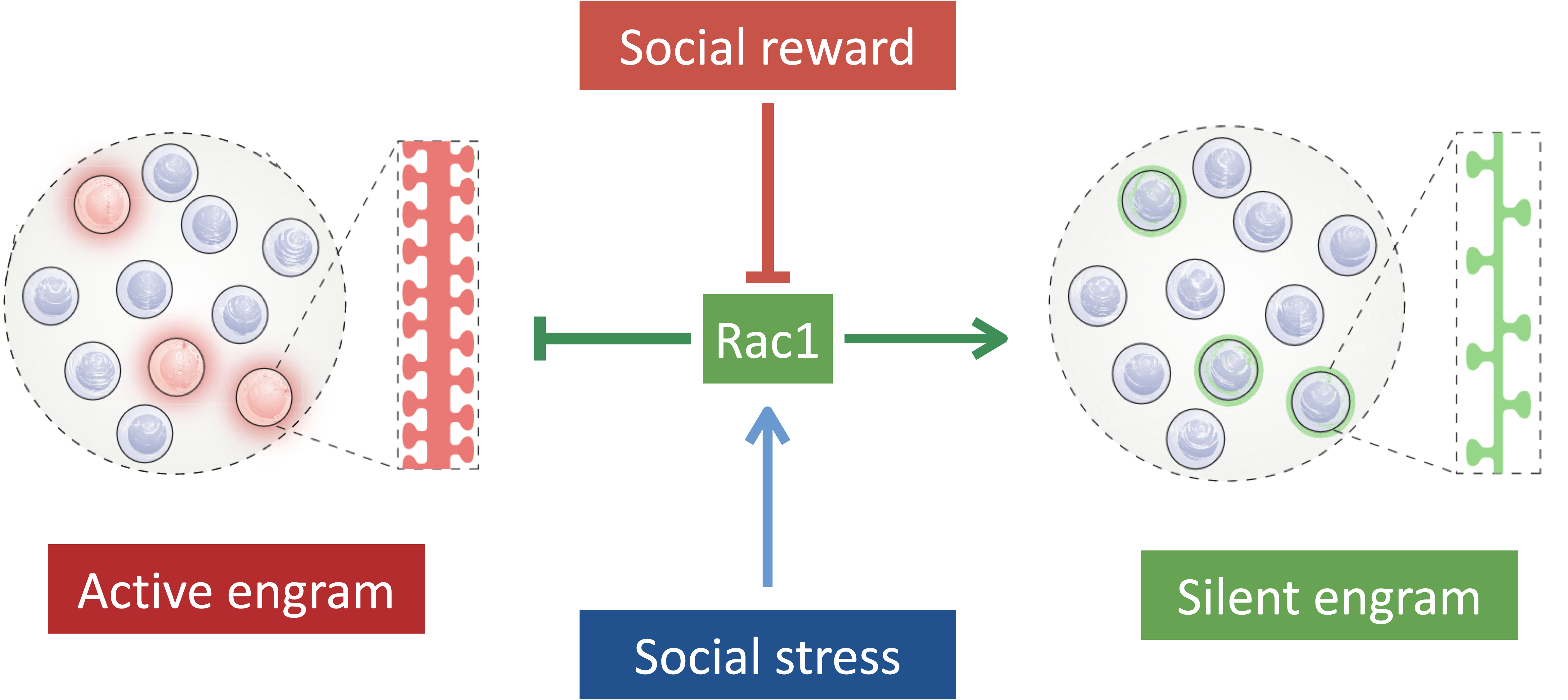 近日,beat365中文官方网站生命科学学院钟毅教授课题组揭示了Rac1-依赖的遗忘机制是情绪状态影响记忆表达的神经基础。在该研究中,课题组聚焦海马体CA1区的记忆痕迹细胞与情绪状态的关系,发现了社交经历引发的情绪可以双向调节记忆痕迹的存储状态,如社交奖励可以将记忆痕迹由沉默态转换为潜伏态,而社交压力可以将记忆痕迹由潜伏态转换为静默态。通过对海马Rac1活性的检测与操纵,我们证明了社交奖励通过抑制海马Rac1、社交压力通过激活海马Rac1来实现记忆痕迹在不同状态之间的转换。如图1所示,该研究提供了一个全新的神经生物学机制来帮助我们理解日常的情绪变化是如何通过切换海马体中的记忆痕迹状态来根据环境变化灵活调节记忆提取的。