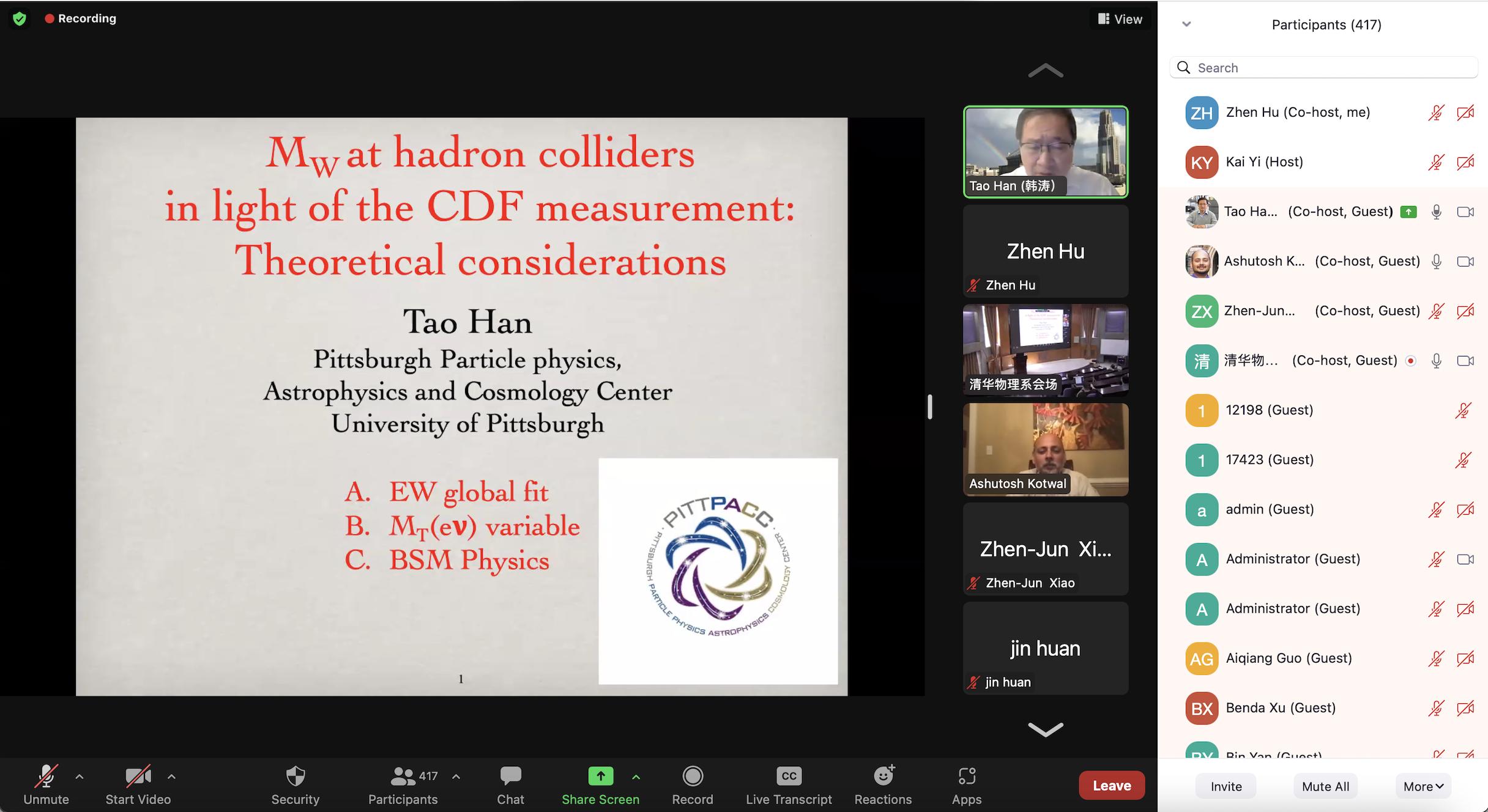 为了促进中国物理同行之间以及与国际同行的学术交流,beat365中文官方网站、南京师范大学、中科院高能物理研究所、北京大学联合发起并主办了本次“W玻色子质量研讨会”。4月14日,来自国内外近百所高校和研究所的专家及学者约500人线上线下参加了会议,同时间段有近7000人次在线观看了直播。中国物理学会高能物理分会副主任、北京大学核物理与核技术国家重点实验室主任、北京大学物理学院院长高原宁院士,北京大学赵光达院士,中科院理论物理研究所张肇西院士,美国匹兹堡大学粒子物理天体物理宇宙学中心主任、美国物理学会“粒子物理与场论”分部主席韩涛教授,国家特聘专家、中科院高能所研究员祝翱(Joao Guimaraes da Costa)等参加了会议和讨论。