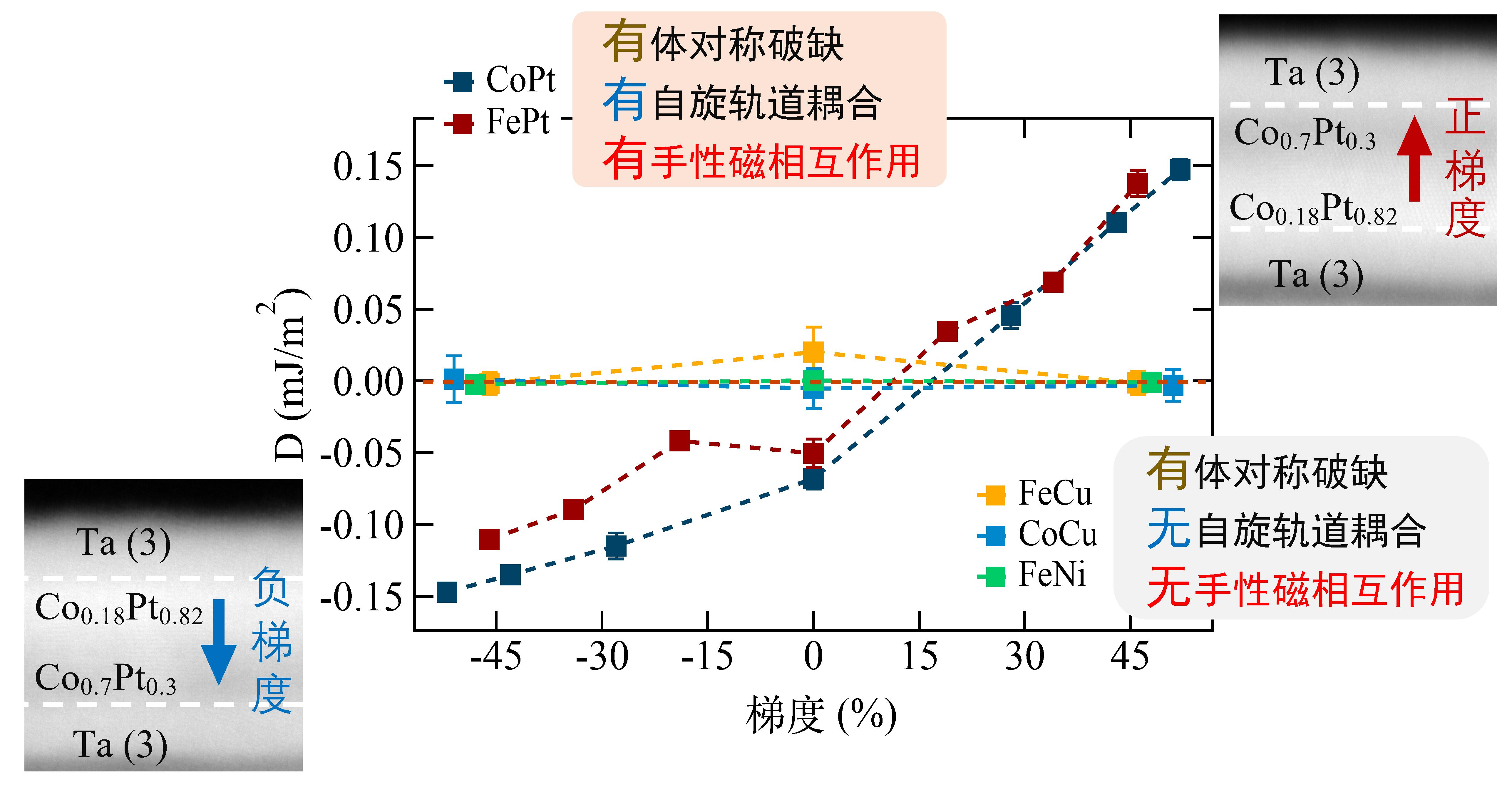中图为手性磁相互作用随厚度方向上成份梯度的变化趋势。在CoPt和FePt合金膜中,由于Pt的强自旋轨道耦合效应,随着成分梯度的增加,手性磁相互作用也相应变化。而在FeCu,CoCu以及FeNi合金膜中,由于不存在强自旋轨道耦合效应,成份梯度自身不会产生出手性磁相互作用。左下和右上角为具有正、负成分梯度样品的透射电镜数据