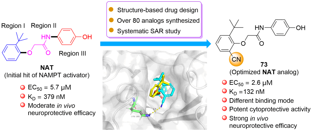 上述研究在《细胞研究》(Cell Research)和《欧洲药物化学期刊》(European Journal of Medicinal Chemistry)期刊上相继发表标题为“烟酰胺磷酸核糖转移酶小分子激活剂的发现及其临床前神经保护活性研究”(Discovery of small-molecule activators of nicotinamidephosphoribosyltransferase(NAMPT) and their preclinical neuroprotective activity)和“烟酰胺磷酸核糖转移酶小分子激活剂的优化及其体内神经保护活性研究”(Optimization of NAMPT Activators to Achieve in vivo Neuroprotective Efficacy)的两篇研究论文。