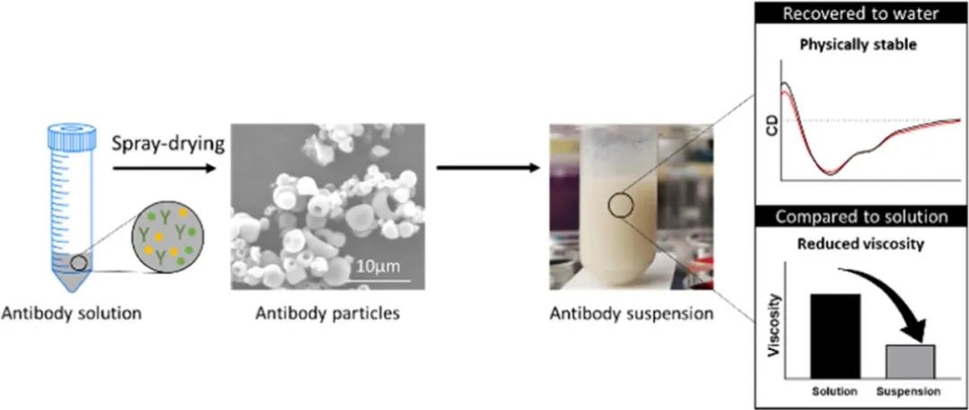 图3:单抗混悬液的技术实施路径:1.使用喷雾干燥技术制备稳定单抗固体颗粒;2.选取非水相有机溶剂混悬单抗颗粒获得高浓度、低黏度混悬液