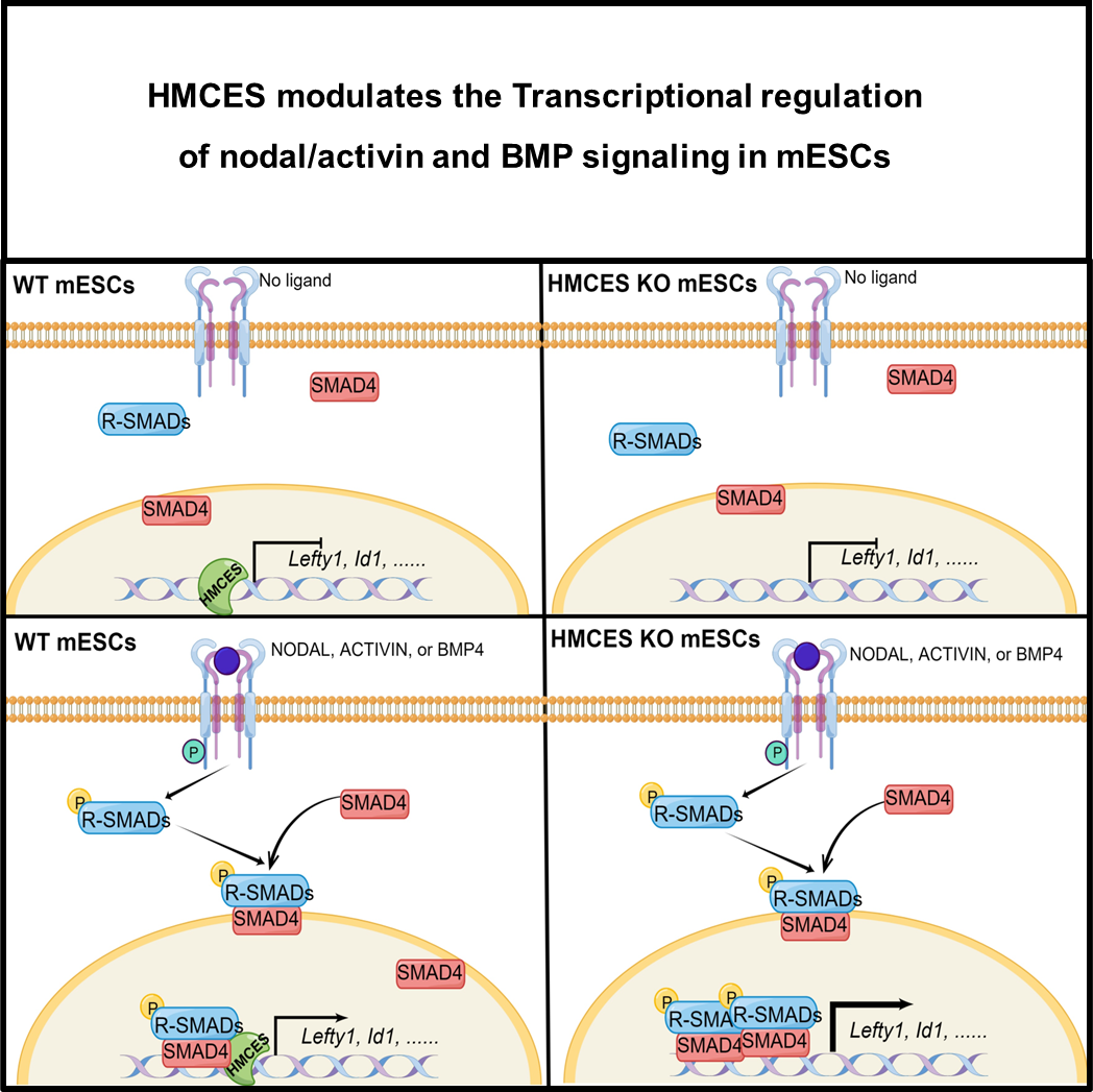 7月12日,beat365中文官方网站郗乔然副教授课题组在《细胞·细胞报道》(Cell Reports)期刊在线发表题为“HMCES参与协调小鼠胚胎干细胞mESCs中activin/nodal/BMP信号通路的转录调控”(HMCES modulates the transcriptional regulation of nodal/activin and BMP signaling in mESCs)的研究论文。该研究发现,HMCES这个具有DNA损伤修复相关功能的蛋白,在小鼠胚胎干细胞中,能够在不影响DNA损伤的基础上对干细胞的分化潜力进行调控。在转录表达谱分析中发现,HMCES的敲除增强了TGF-β家族信号通路经典靶基因的转录本表达。HMCES与R-SMAD蛋白结合,共同定位于标记转录激活的修饰组蛋白处。然而,HMCES结合染色质独立于TGF-β家族信号通路。从机制上讲,HMCES竞争性地结合染色质以限制R-SMAD蛋白的结合,从而迫使R-SMAD从染色质解离并导致抑制它们的转录功能,进而影响TGF-β家族信号通路在胚胎干细胞分化中的功能。在非洲爪蟾胚胎中,HMCES敲低会导致显著的发育缺陷,并伴随着左右轴不对称异常以及lefty1的表达增加。这也表明HMCES在非洲爪蟾胚胎早期发育过程中通过影响TGF-β家族信号通路,而影响胚胎发育。总之,该研究揭示了HMCES参与协调nodal/activin和BMP信号通路的转录调控。