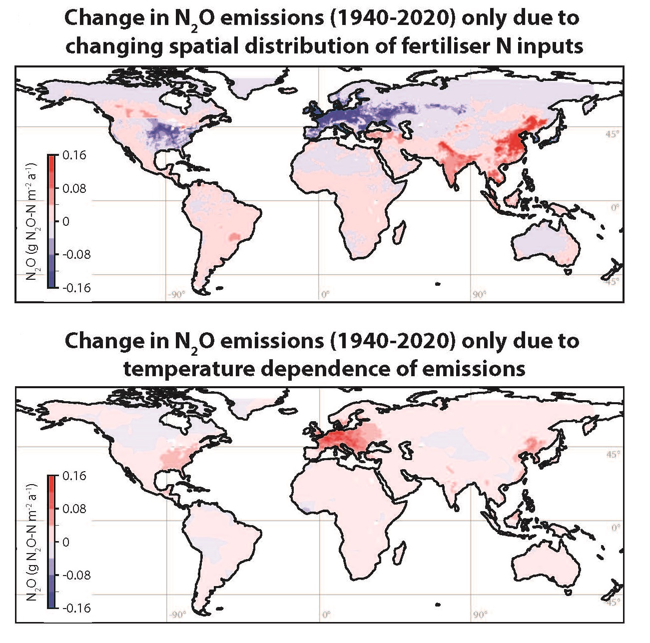 模型结果表明,2020年全球N2O平均排放系数(氮输入加权平均)高达4.3%,明显高于政府间气候变化专门委员会(IPCC)默认的评估系数1.4%。同时,N2O排放系数全球分布非常不均匀,温暖湿润的地区排放系数最高。在过去一个世纪,全球N2O排放系数显著升高,其主要驱动因素是气候变暖和氮肥输入的再分配(由温带至热带、由发达国家至发展中国家),而这两项因素分别额外贡献了0.8和0.5TgNa-1的N2O排放量。在未来N2O排放预测和减排政策的制定中,应当高度重视气候变化的反馈作用和区域排放热点的贡献。
