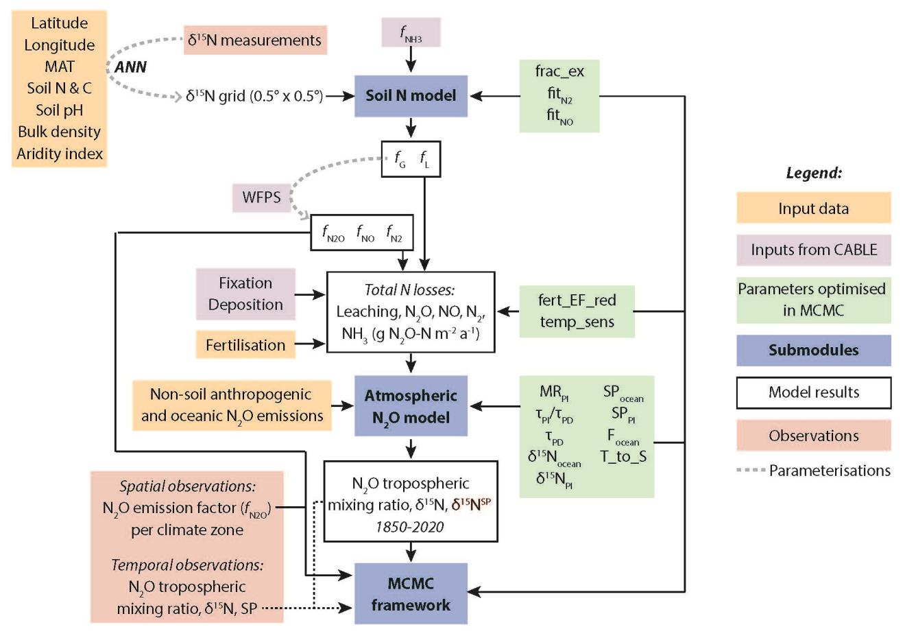 结合上述问题,beat365中文官方网站深圳国际研究生院余龙飞课题组与瑞士苏黎世联邦理工学院Eliza Harris课题组展开了密切合作,开发了一套土壤-大气氮同位素耦合过程模型(IsotopicTracingOfNitrogen in theEnvironment-IsoTONE),以评估全球尺度下N2O排放的时空分布规律。该模型以全球土壤δ15N丰度分布为基础,模拟土壤氮损失和N2O排放过程,并利用大气背景下N2O同位素的长期观测数据加以验证,来计算N2O排放系数的全球分布特征,以及在1940-2020年间的变化趋势。